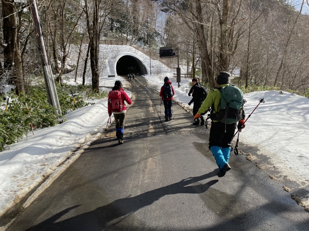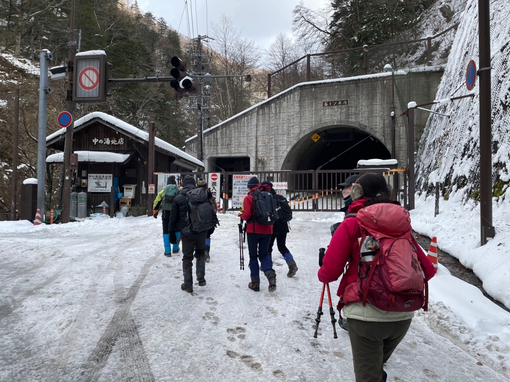 ②約15分で、中の湯バス停に着きました。上高地の入口の釜トンネルはすぐです。道路は冬場で封鎖されています。