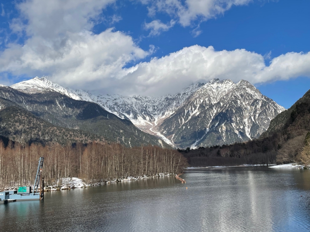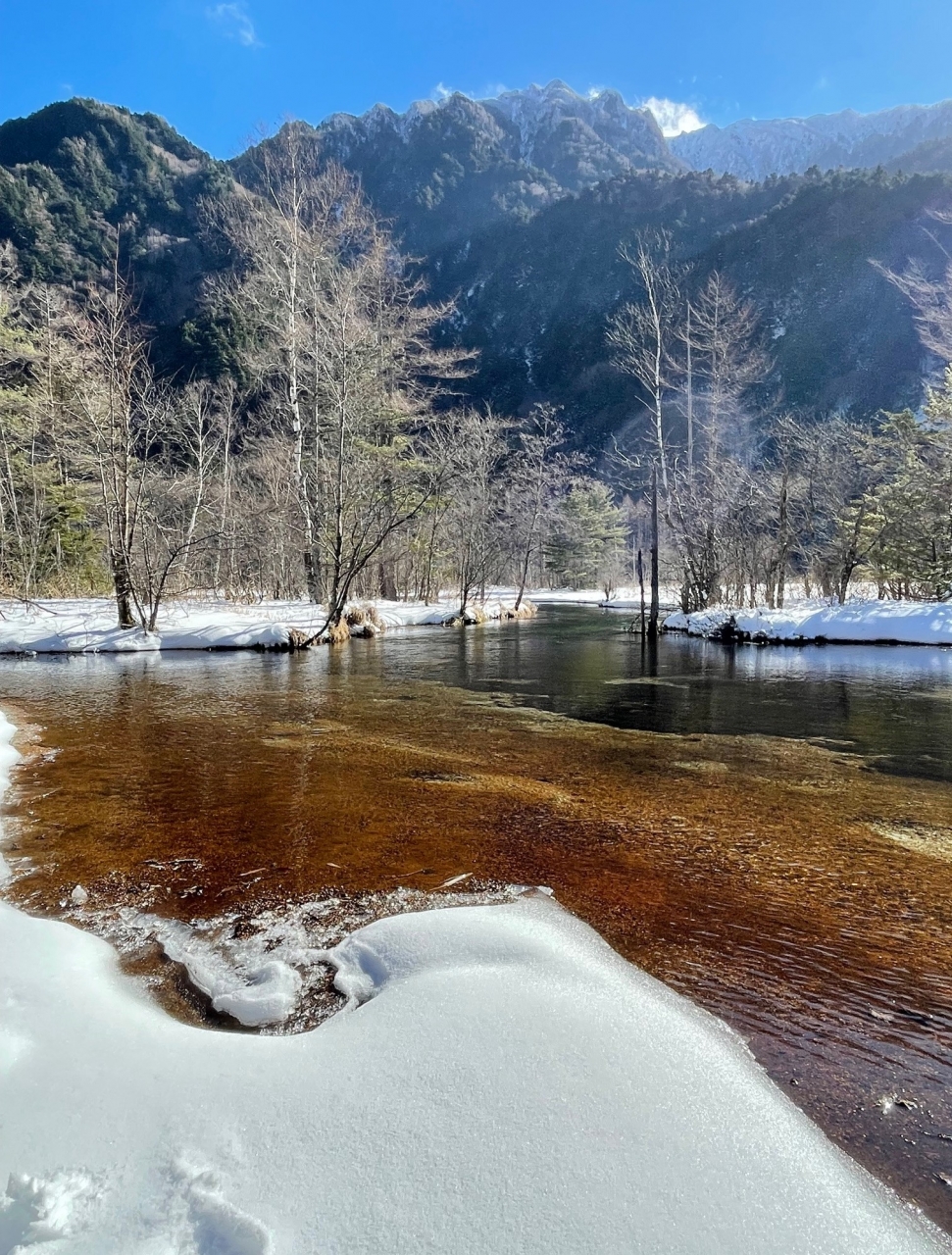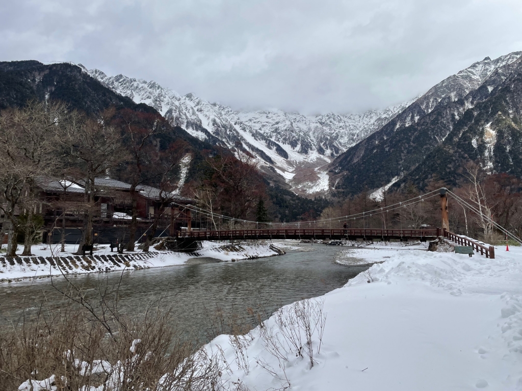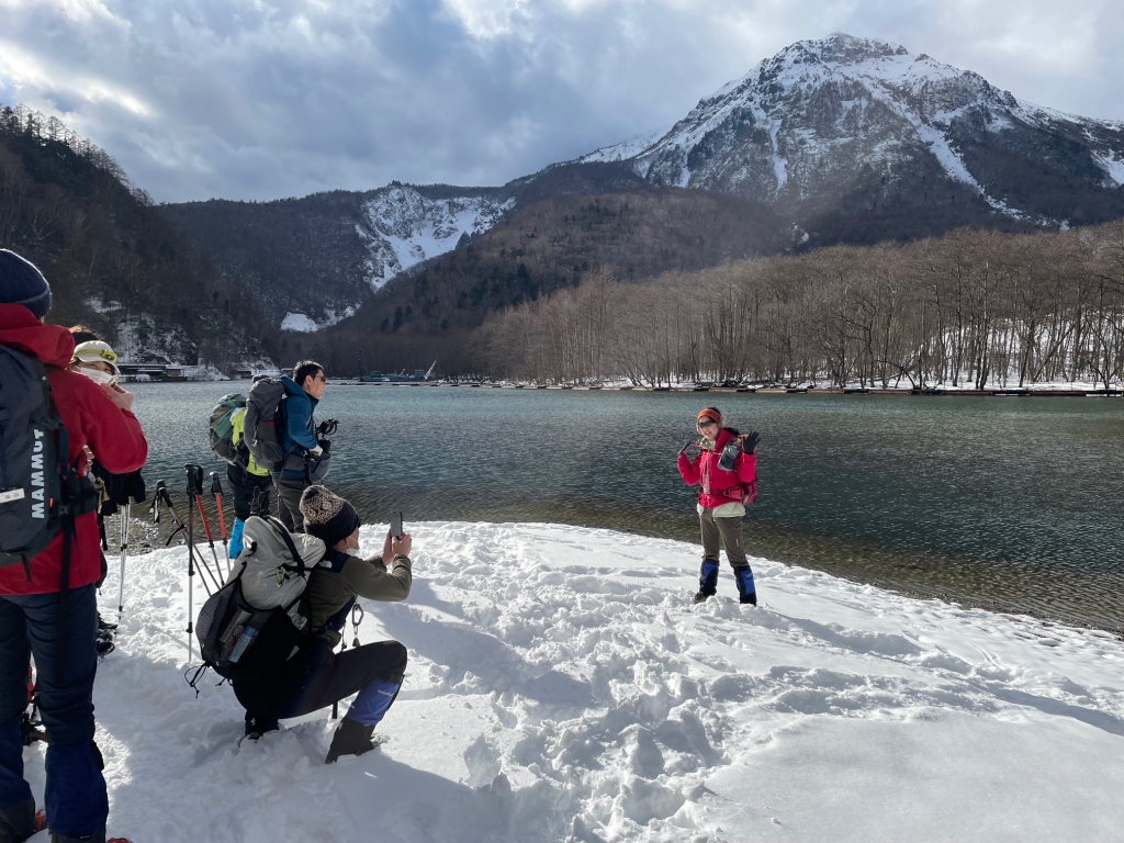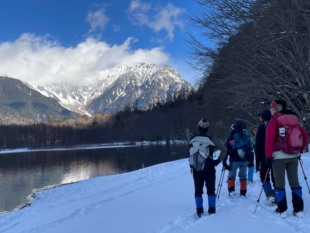 大正池では、雪に覆われた水面と立ち枯れの木々がつくる幻想的な風景に思わず足が止まります。田代湿原では、木道の先に広がる冬ならではの静かな湿原を堪能し、河童橋では穂高を望む定番の景観も、この季節ならではの落ち着いた表情を見せてくれました。踏みしめる雪の感触と、澄んだ空気の冷たさを楽しみながらの冬散策は格別で、上高地の新たな魅力を味わう一日となりました。