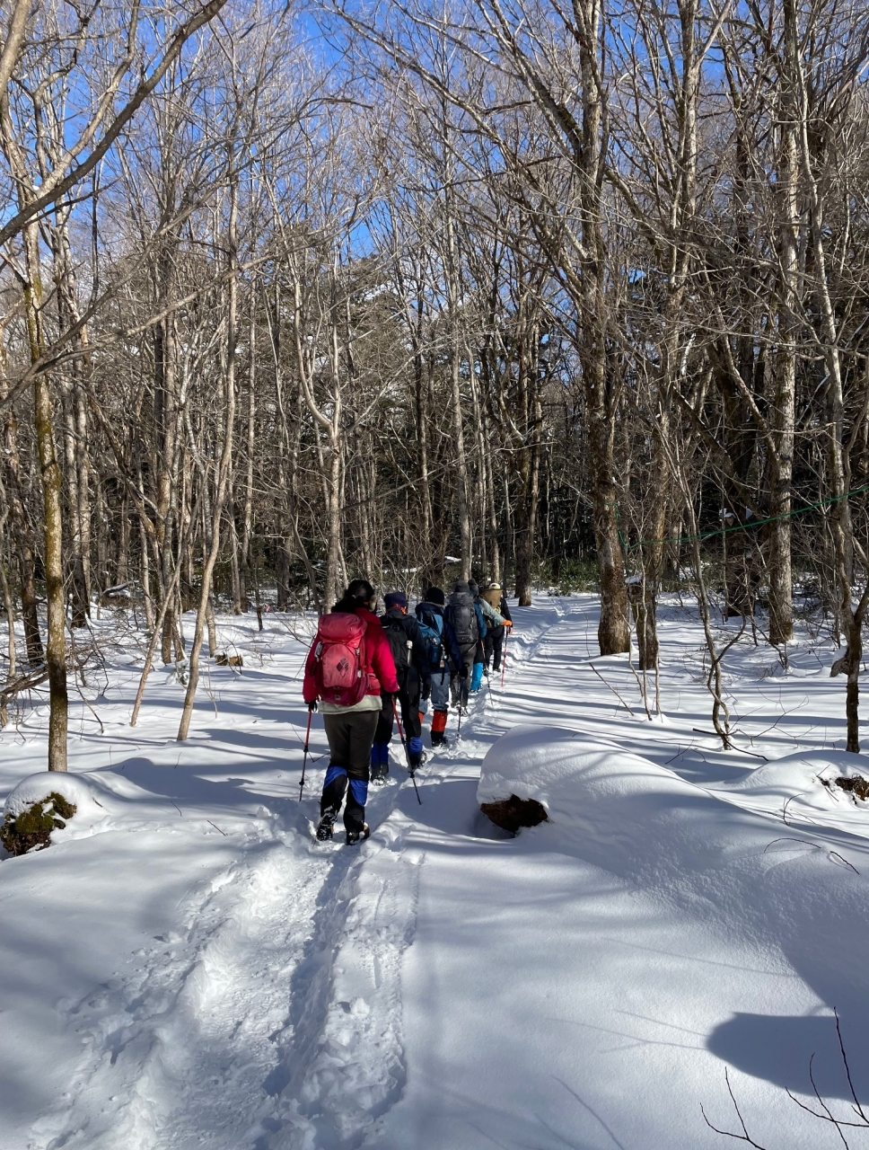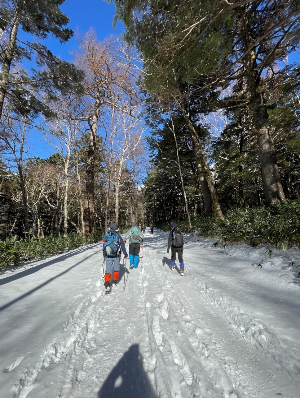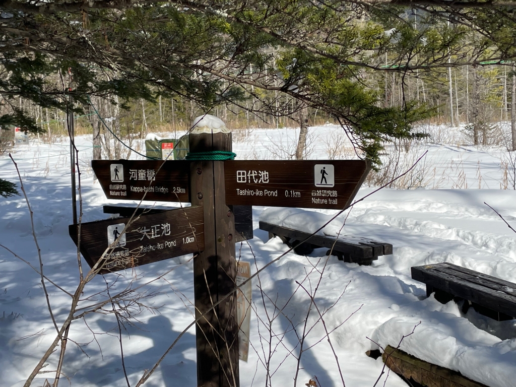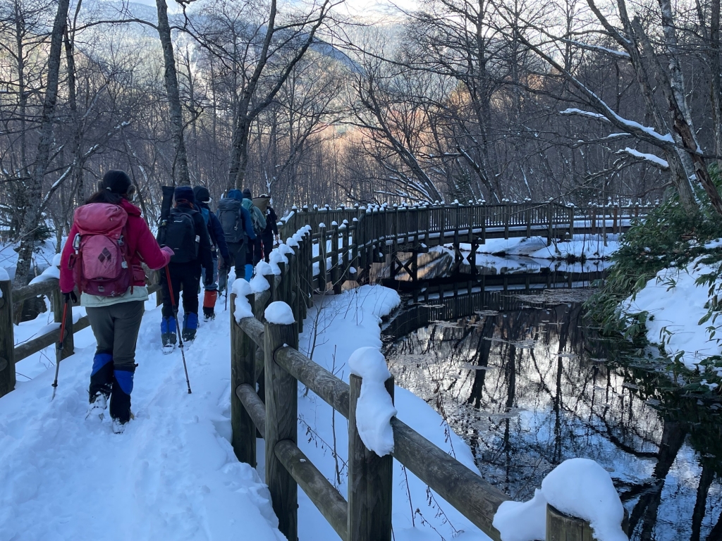 大正池では、雪に覆われた水面と立ち枯れの木々がつくる幻想的な風景に思わず足が止まります。田代湿原では、木道の先に広がる冬ならではの静かな湿原を堪能し、河童橋では穂高を望む定番の景観も、この季節ならではの落ち着いた表情を見せてくれました。踏みしめる雪の感触と、澄んだ空気の冷たさを楽しみながらの冬散策は格別で、上高地の新たな魅力を味わう一日となりました。