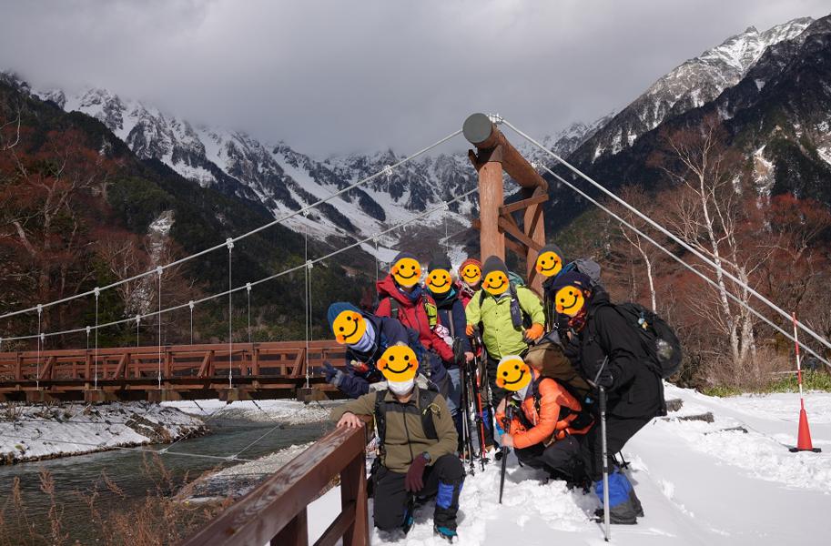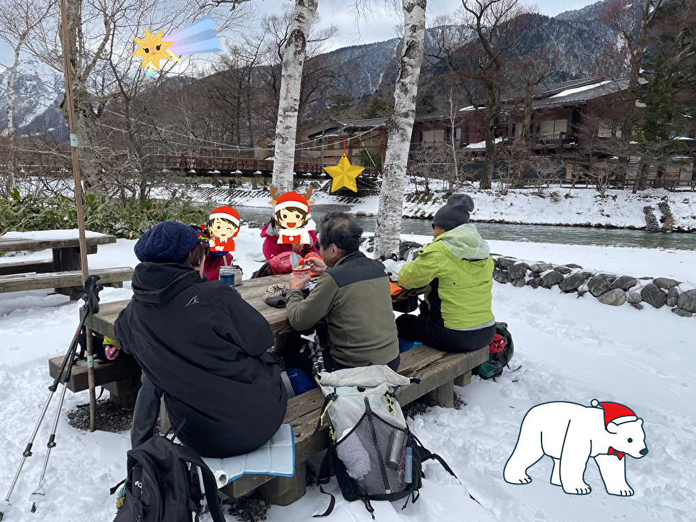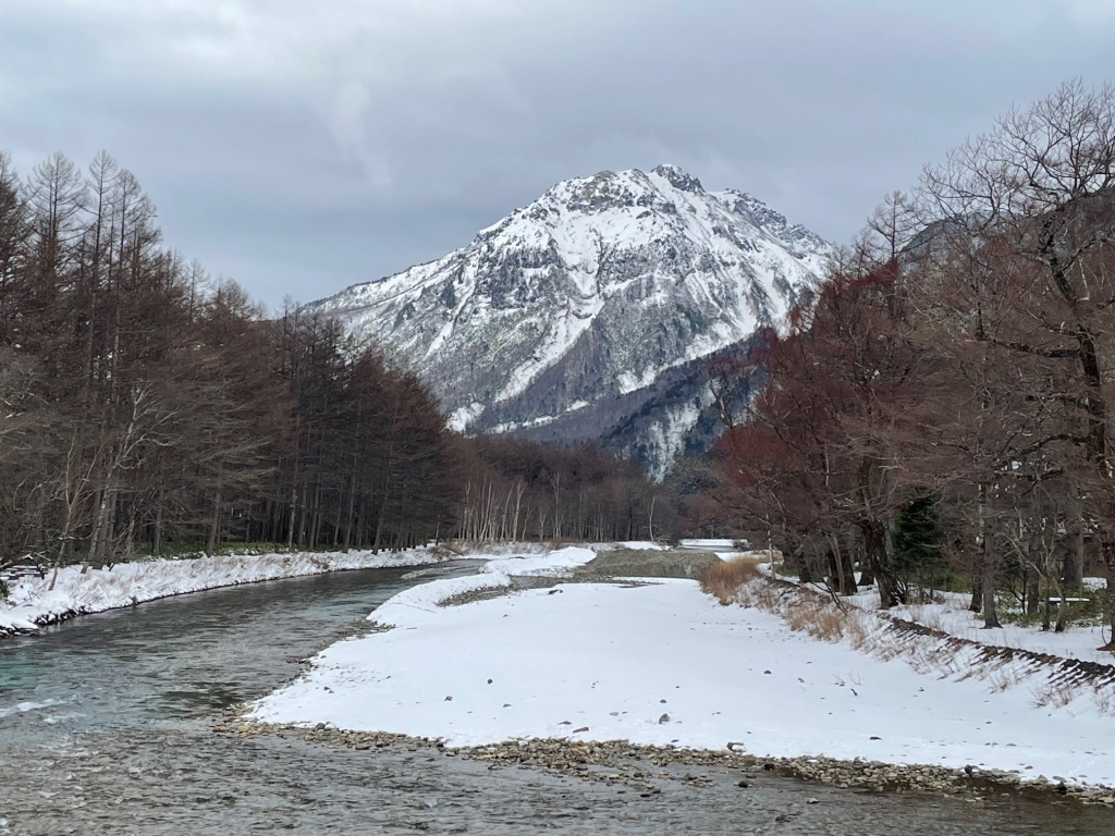 二十四節気の「大雪」を迎えた12月7日(日)、私たちは長野県・上高地を訪れました。中の湯・釜トンネルから大正池、田代湿原、河童橋へと静かな冬の道を歩きました。夏には多くの登山者や観光客で賑わう上高地ですが、この日は一面に雪が積もり、ほとんど人もおらず、まるで景色を独り占めしているかのように静寂が広がっていました。時折雲の切れ間から陽光が差し、焼岳の荒々しい姿が際立って見えました。また、穂高連峰も頂上近くまでその雄大な姿を現し、雲に隠れながらも私たちを迎えてくれました。