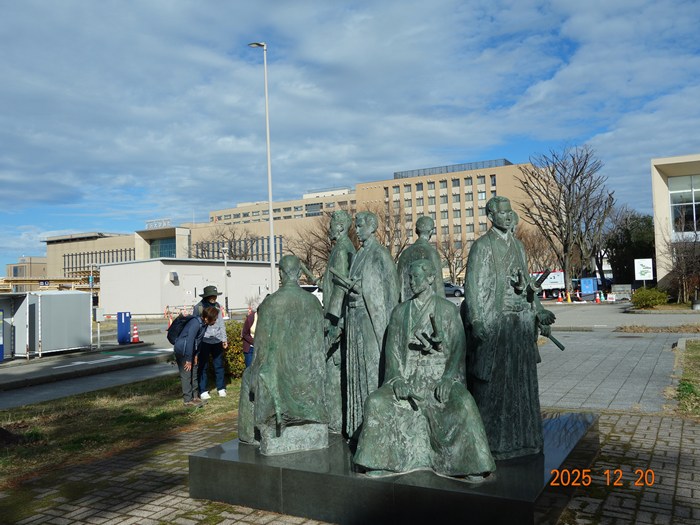 16.金沢大学病院内に設置されたいた銅像(金沢医学館(金沢大学医学部)の第一期生9名の銅像)