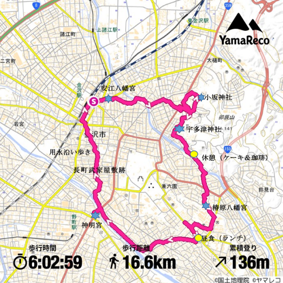 1. ヤマレコ記録(16.6Km 6時間(休憩を含む)の街歩き