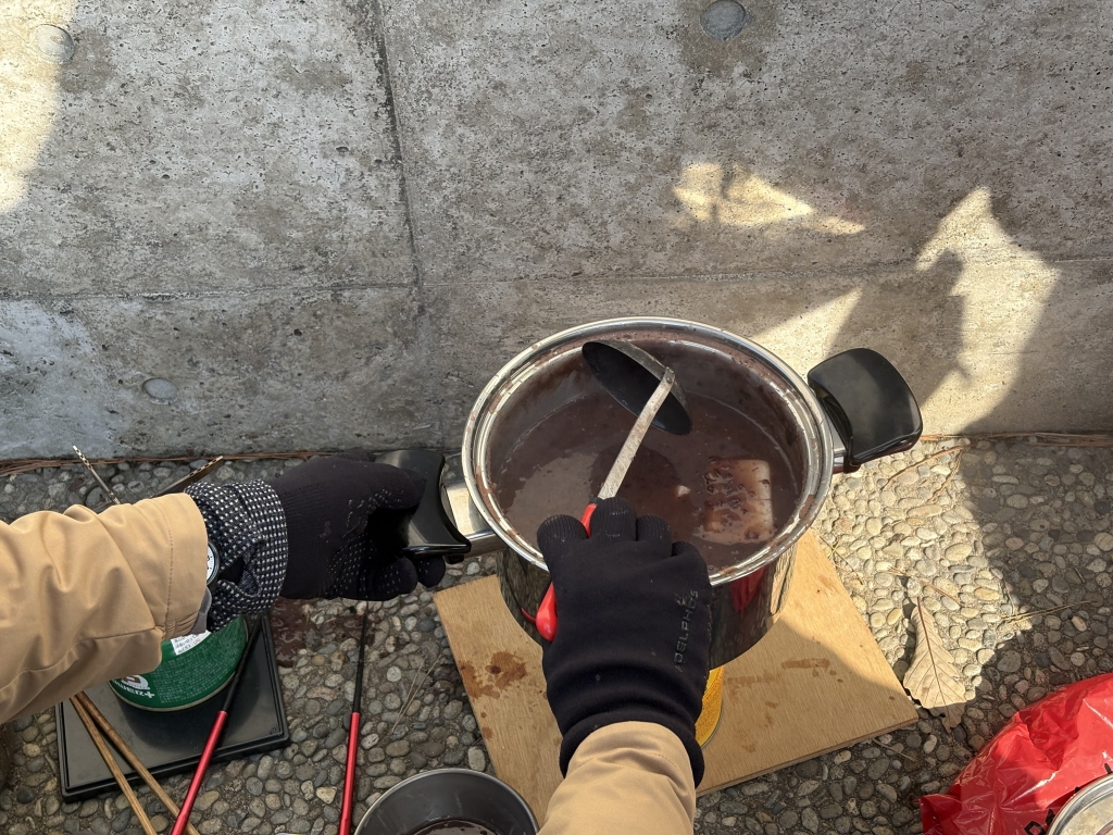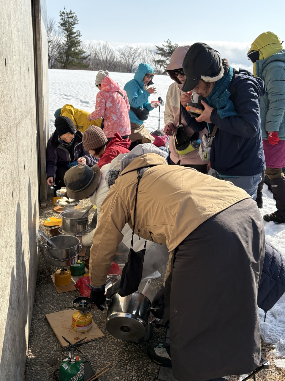 会場をキゴ山に、昼食は餅持ち寄りのぜんざいをセットで開催。雪が少なかったが、緑地公園での歩行練習には何とか形になり、安堵。山頂までの登りは所々雪の無い場所もあり、登山道を外れた安全で雪のある場所を直登したりしたが、かえって実践的な練習になったのかも知れない。山頂では、ツエルトビバークグループとぜんざい昼食準備グループに分かれて活動。山頂は風が強かったが風に負けないビバーク用ツエルトの設営が出来たことはよかった。斜面を利用した雪洞作りのためには雪が少なかったため、ザックを使った雪洞作りにトライ。雪を積み上げたのちドキドキしながらザックを引き抜いたが思いの外しっかりしていて感激。ぜんざい昼食準備は風の強い中、餅焼き、ぜんざい温めとこちらも奮闘の中、ツエルトビバークも合流して温かいぜんざい昼食を楽しんだ。甘さに笑顔が溢れる。下山は草や木々の引っ掛かりリスクを回避するため、上りで使ったルートは使わず、今年閉鎖中のスキー場ゲレンデを使用した。斜度があるためジグザグにトラバースルートを設定して安全を確保して下山した。斜度の少ない場所は各自でルートを選んで自由に歩いてもらい、バリエーションのある練習になったように思う。キゴ山を会場として2年目。今回は雪が少なかったが、たまたまスキー場が閉鎖されていたこともあり、いろいろな斜面での練習が出来たように思う。ぜんざいも2年目。ご褒美があると練習も楽しい。メインはワカン初体験の方9名の方を中心にワカン歩行の基礎、雪山行動の基礎を知ってもらうことだが、ぜんざいは共同装備の考え方を知ってもらうのにも役立ったように思う。協力頂いた熟練の方々の感謝もあり、充実した練習会になったと思います。感謝申し上げます。(記 CL)