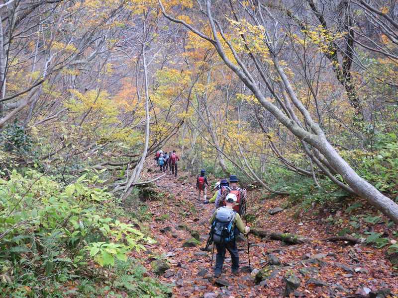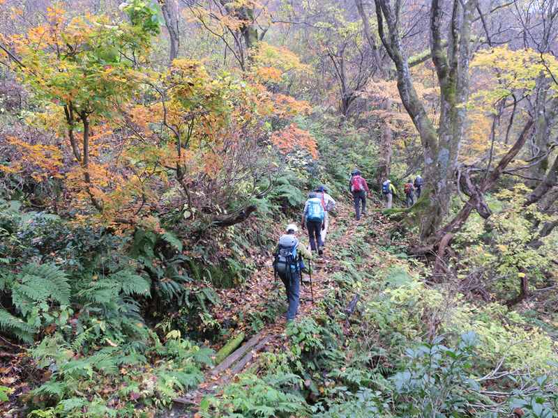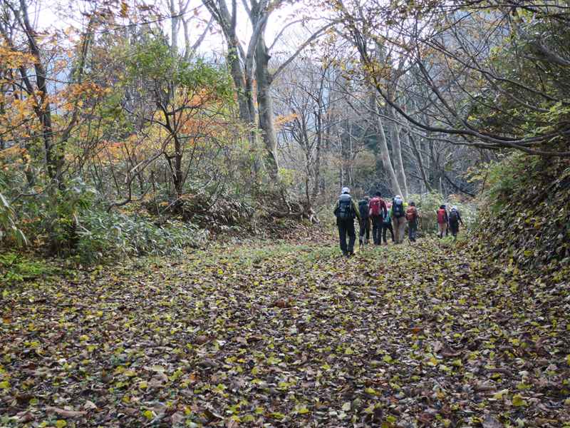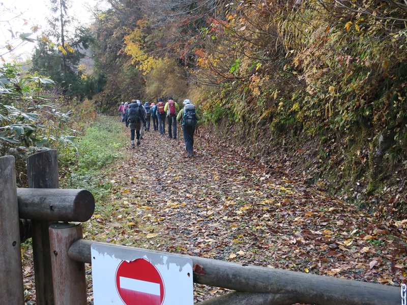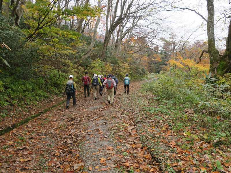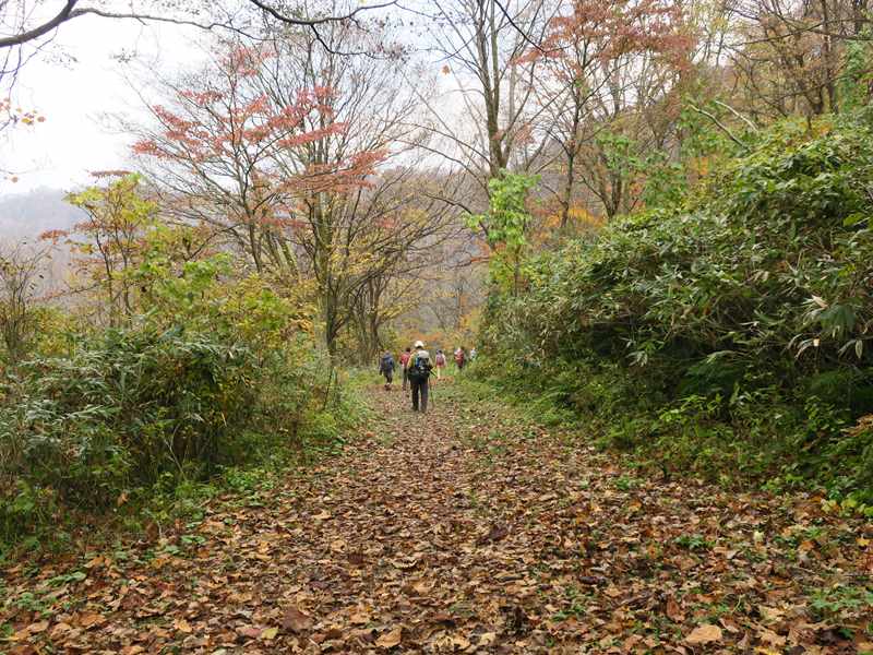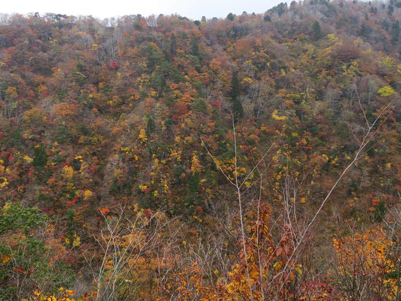(コースタイム)医王山ビジターセンター8:12 → 8:52大沼(三蛇ケ滝立ち寄り)9:30→ 10:40白兀山(少し下がり好展望の場所で昼食) 11:35 →覗休憩所12:12→ 12:50大沼→ 三色泉立ち寄り→ 林道→14:05医王山ビジターセンター(報告)薄曇り.医王山ビジターセンターに集合.立派な施設と駐車場だが途中の林道に狭い箇所あり.大沼までは晩秋の林道(といっても車通行不可)を歩いていく.医王の里から登る風景とは違い,自然豊かで新鮮な感じである.大沼からは三蛇ヶ滝に降りた.大沼からは白兀山までの上りは人は少なく静かな歩きを楽しめた.白兀山山頂は人だかり.天気は曇りで霞んでおり眺望は楽しめなかった.少し降りた展望のよいところで昼食.覗きを経由して大沼に降りた.時間が早いので三色泉に立ち寄ることとした.めったに行かない場所と思うが,湧き水のある小さな池であった.三色泉からショートカットして林道に出て,そのままビジターセンターに戻った.全般的に,紅葉は過ぎた感じで,落ち葉の上を歩く感じだった.気温もほど良く快適な山歩きを楽しめたと思う.医王山ビジターセンターから林道に入る.大沼までの道は広く,落ち葉の上を歩く感じ.三蛇ヶ滝に降りていく.大沼の紅葉大沼から白兀山を目指す.覗きから大沼に下る.三色泉を経てビジターセに戻る途中.林道から見た向かい側の尾根の紅葉.