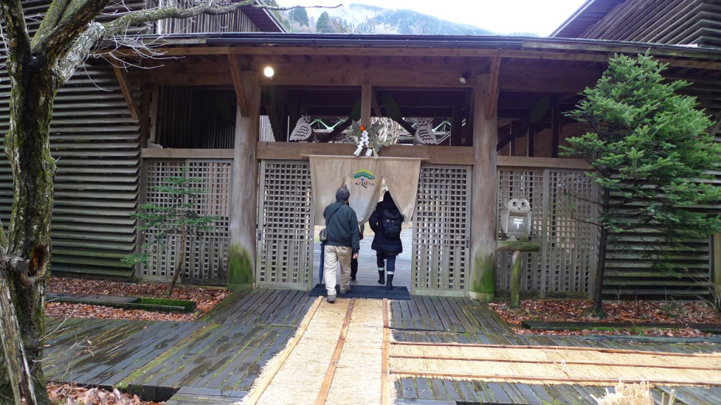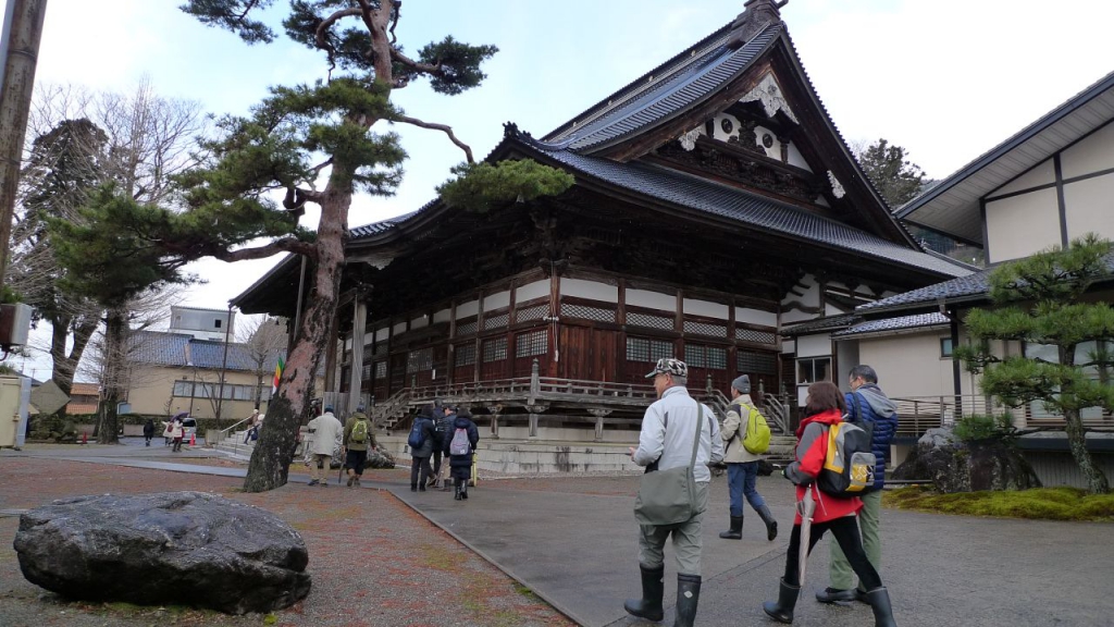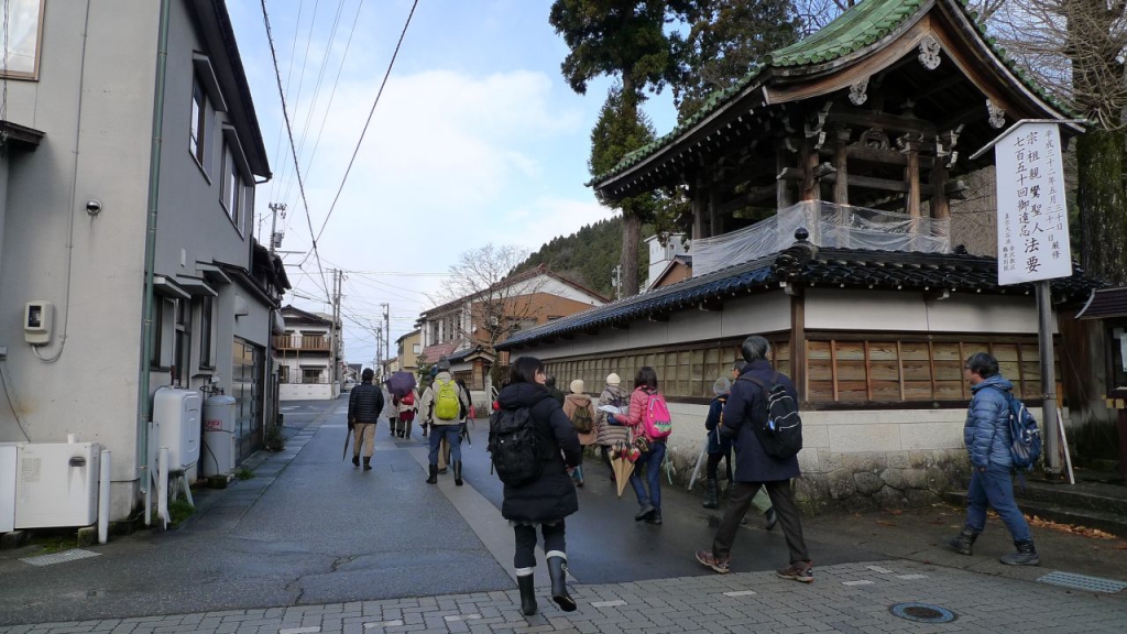 すがすがしく鳥居を出たら、登り初めは目の前の舟岡山だ。標高178m、白山比咩神社創祀之地である。手取川を見下ろす杉木立の中、濡れ落ち葉を踏みしめて小丘を登れば、今年も元気に山を楽しめそうな予感。県立白山青年の家の裏手に降り、暫し鶴来の街を歩き、火伏不動尊から鶴来別院を抜けて白山本宮四社の一社金剣宮に参る。願掛けもほどほどに、一行はパラグライダー着地場を横目に食事処「もく遊りん」へ。個室ひと部屋を占拠し、賑やかにピザとパスタ、コーヒーでお腹を満たしたら、帰途は八幡宮の栃の古木と泰澄石仏にもお参りして、午後の初詣客の車が長蛇の列をなす駐車場へと向かう。