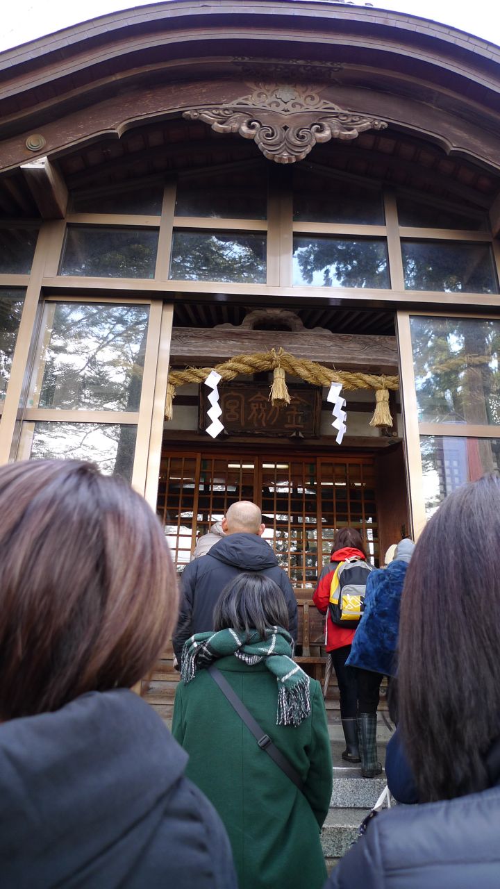 控えの間から拝殿に通され、ご祈祷が始まった。神職が祝詞を奏上したあと参拝団体名が読み上げられると「金沢ハイキングクラブ」の呼称に一同かしこまる。二人の白拍子が演じる巫女神楽は美しい剣の舞。会長が玉串を捧げ、私たちも白山大神の前に恭しく頭を垂れて一年の安全を祈った。巫女の福鈴から清らかな鈴の音が降り注がれてご祈祷は恙なく終わった。
