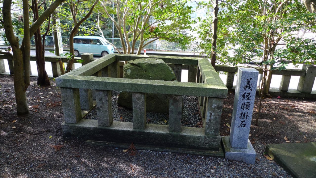 1186年、奥州へ都落ちする義経主従が参拝した折、神楽を奉納しこの石に腰掛けたと伝わる