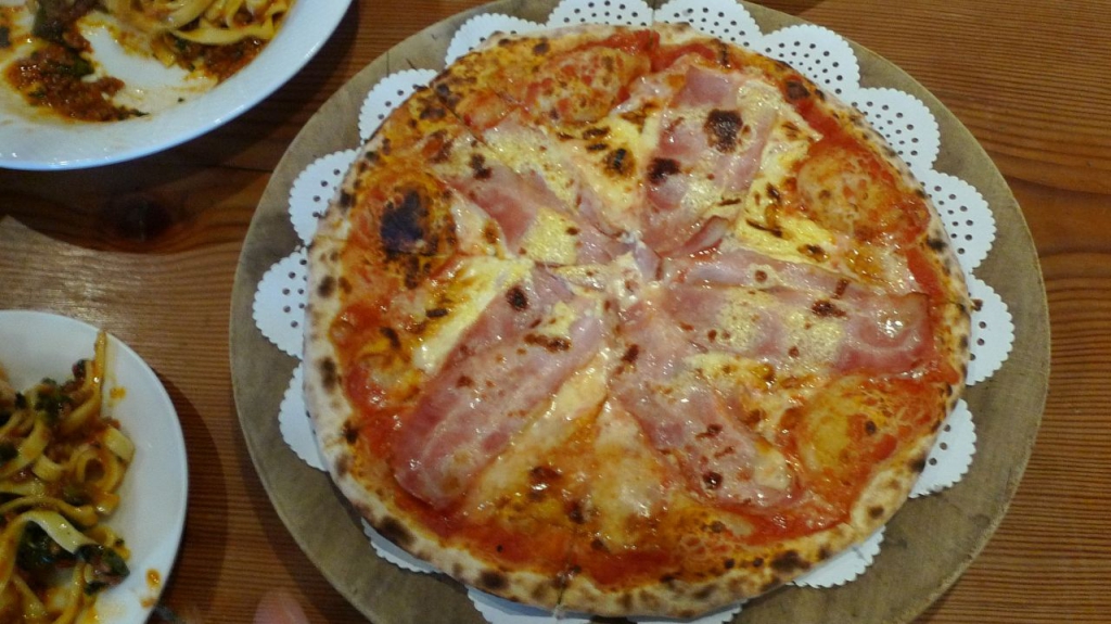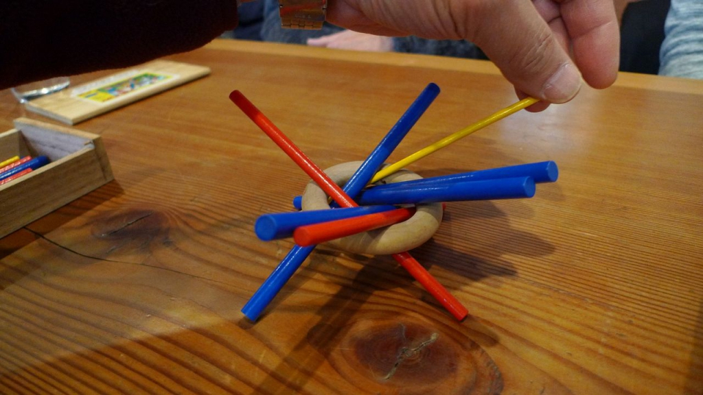 ピザを待つ間、木製玩具(スティッキー)と戯れる