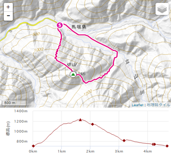 集合8:00→ 馬場島駐車場 9:50→ 中山登山口10:10→ 中山頂上(昼食) 12:15~13:00→クズバ山分岐13:20→東小糸谷入口14:30→馬場島駐車場15:00→解散16:40