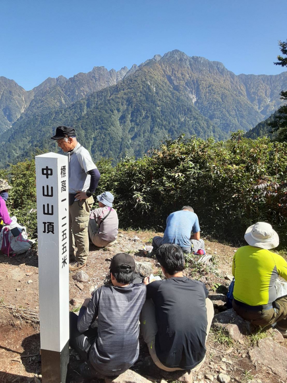 中山頂上に到着し、剱岳をバックに記念写真を撮り、昼食としました。特に剣山頂に続く、小窓尾根のギザギザがクッキリと展望出来ました。2000m以上は紅葉が始まっています。