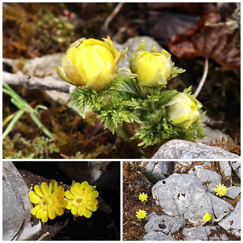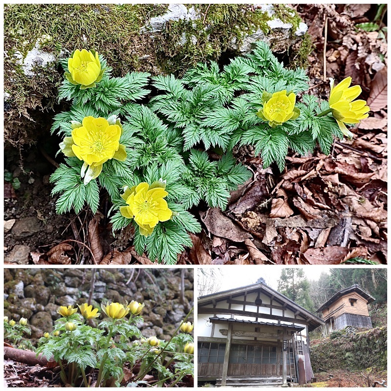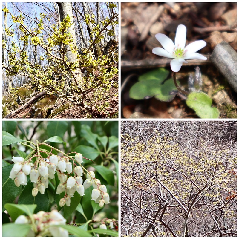 福寿草以外で咲いていた花。左上:オニシバリ(鬼縛り)、右上:ミスミソウ(三角草)、左下:アセビ(馬酔木)、右下:ダンコウバイ(壇香梅)