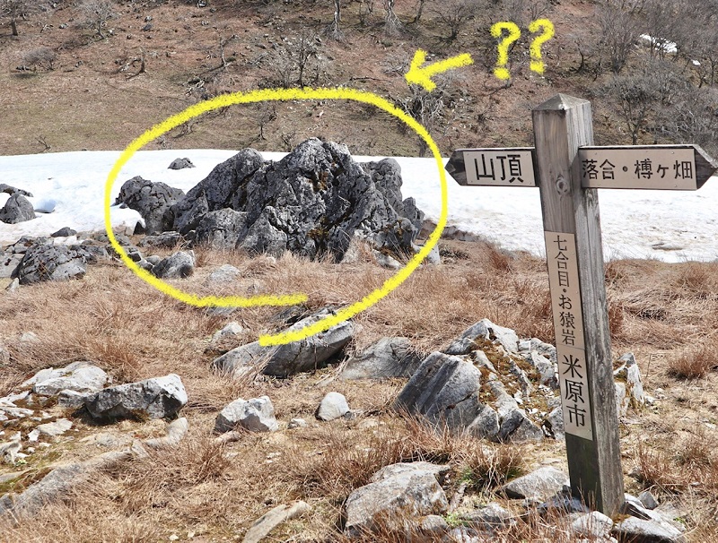 7合目の「お猿岩」。 どこに猿が?と論議。調べたところ、浸食が進み、猿の面影がなくなってしまったようです。