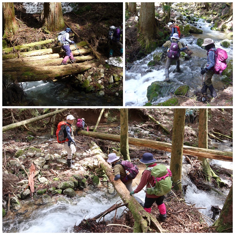 下山時、泥濘で転倒を心配していたが以外に道は乾いており、誰も転倒なし。最後の難関?今年は積雪が多く水量が増え、水を被っている石の渓流を3回渡渉。誰が滑って水浸しになってもおかしくない状況を全員難なくクリア!さすがです!