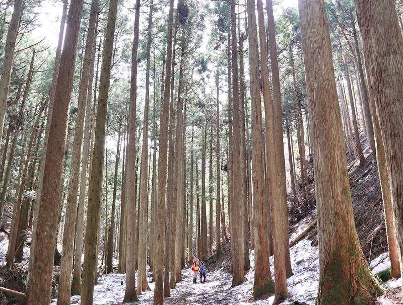 下山時、急遽、稜線ルートを止め「フリートレイル」に変更!とSLより。掛け声と同時に一斉に各自ショートカットで駆け降り、霊山神社の鳥居を目指すメンバー。本領発揮!皆さん、超早い!