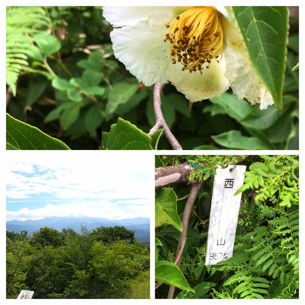 山頂は貸し切り状態。植物園から、ここまで登る人は少ないようです。山頂の標識は夏椿の木に結び付けられており、ちょうどお花が満開でした。晴れていれば白山山系を一望できるのですが、残念ながら山頂は雲の中でした