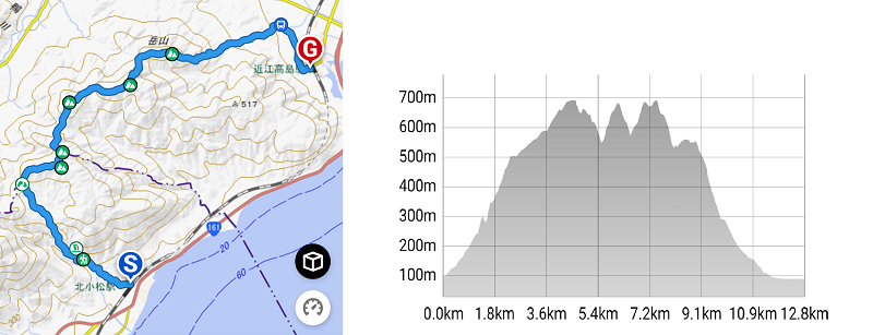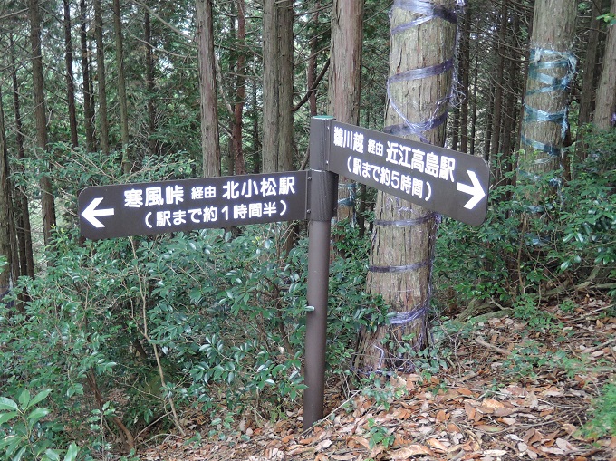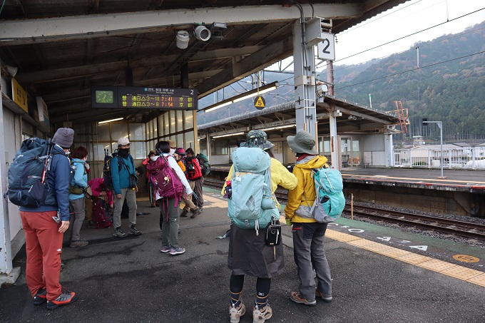 比良山地の北部にあるリトル比良。JR高島駅近くの駐車場に車を停め、北小松駅までJRで移動します。金沢と大阪を結ぶJR・サンダーバードが通る湖西線は、比良山地から吹き降ろす強風の影響を受けやすく、遅れたり米原経由に変更になったりと金沢ではなじみ深い路線です。 ずっと雨の予報でしたが、直前で何とかくもり予報に。途中小雨に降られはしたものの、楊梅の滝、奇岩のオーム岩、かつての参詣道の名残をとどめる祠や灯籠、突如現れる真っ白な砂の山・白坂など変化に富んだ山行を楽しみました。縦走路はアップダウンを繰り返し、歩行距離は約14km、累積標高差は1,100mという「リトル」という名前にそぐわない歩き応えのあるコースでした。JR高島駅から1駅の北小松駅へ向かいます楊梅(ようばい)の滝は、滋賀県一の落差76mを誇る3段の滝。まずは15mの雌滝へ雌滝から滑りそうな岩をたどり、慎重に登山道に戻ります雄滝へは急な登山道を登り返します落差40mの雄滝はなかなかの迫力寒風峠 名前どおり寒い。さすが12月です3時間以上経った時点でこの標識。あと5時間もあるの?と皆ざわめく岩阿沙利山を少し降りたところで昼食。風が冷たく寒くて、温かい食べ物がありがたいオウム岩からの眺望 琵琶湖が綺麗 オウム岩から下をのぞき込むと、メンバーが手を振ってます日本庭園みたいまだまだ下りますシダ・ジャングルをかきわけ進みます