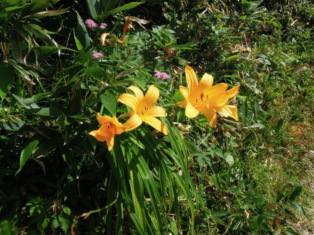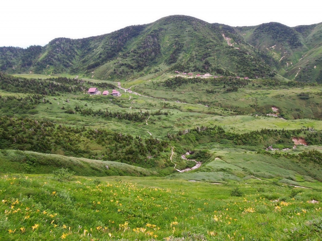 斜面に群生するニッコウキスゲと南竜ケ馬場