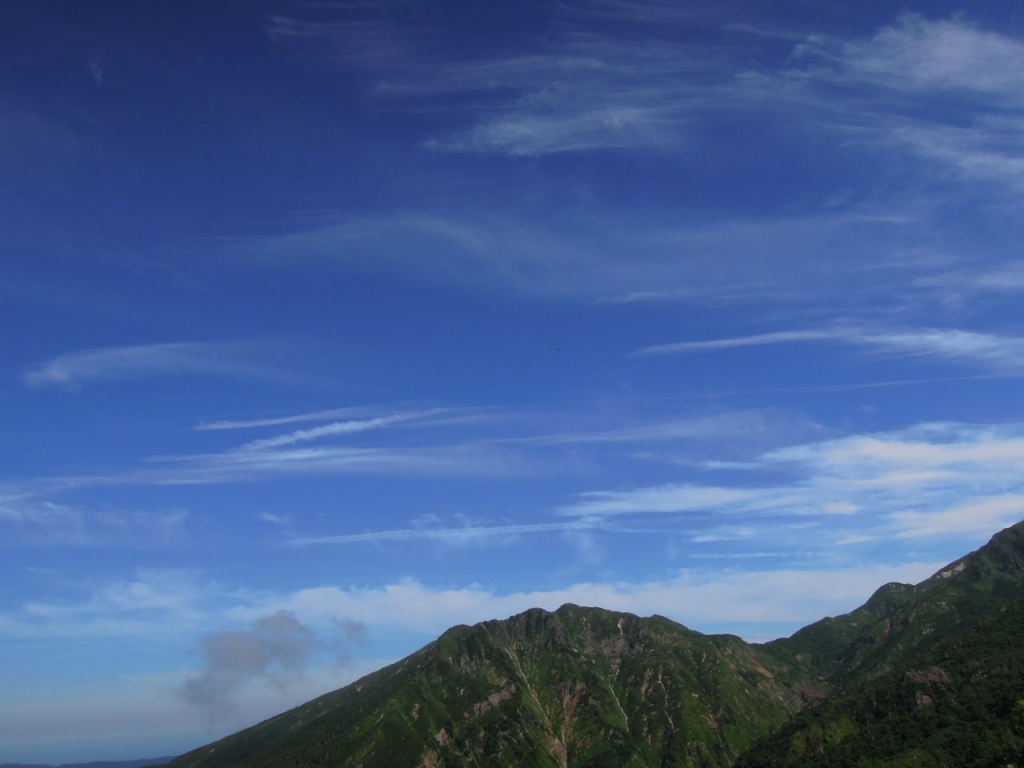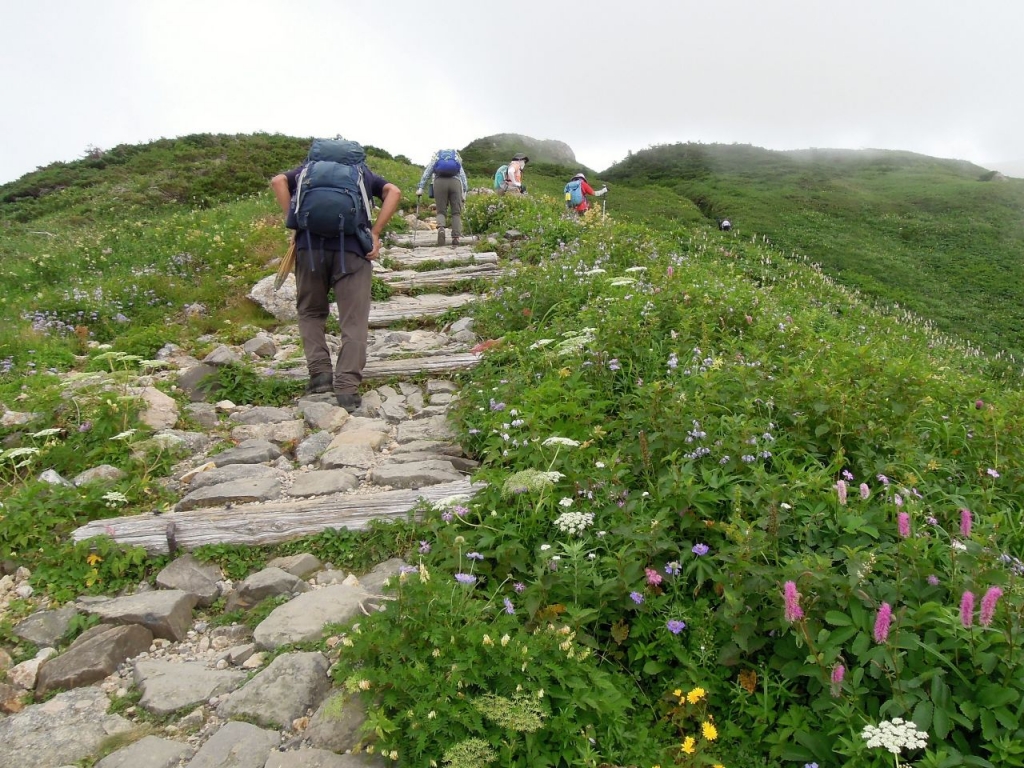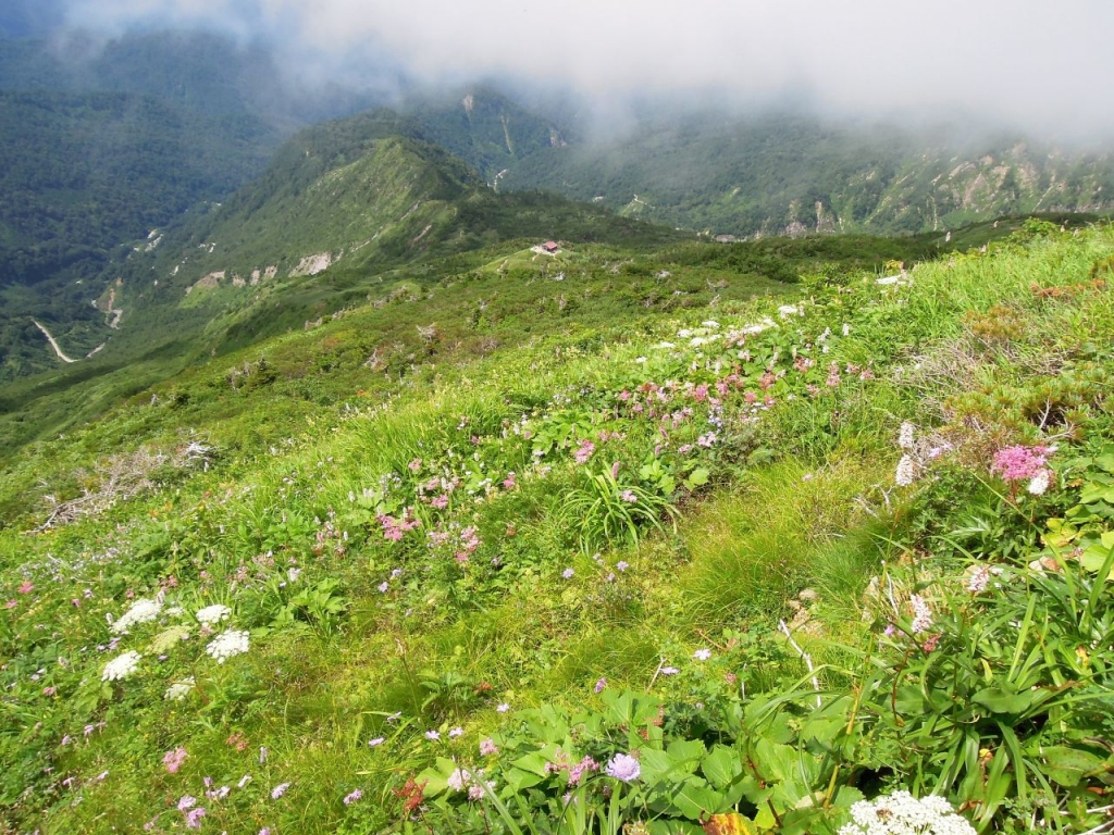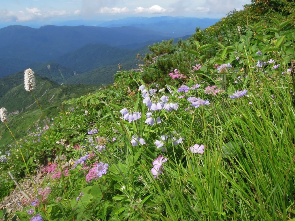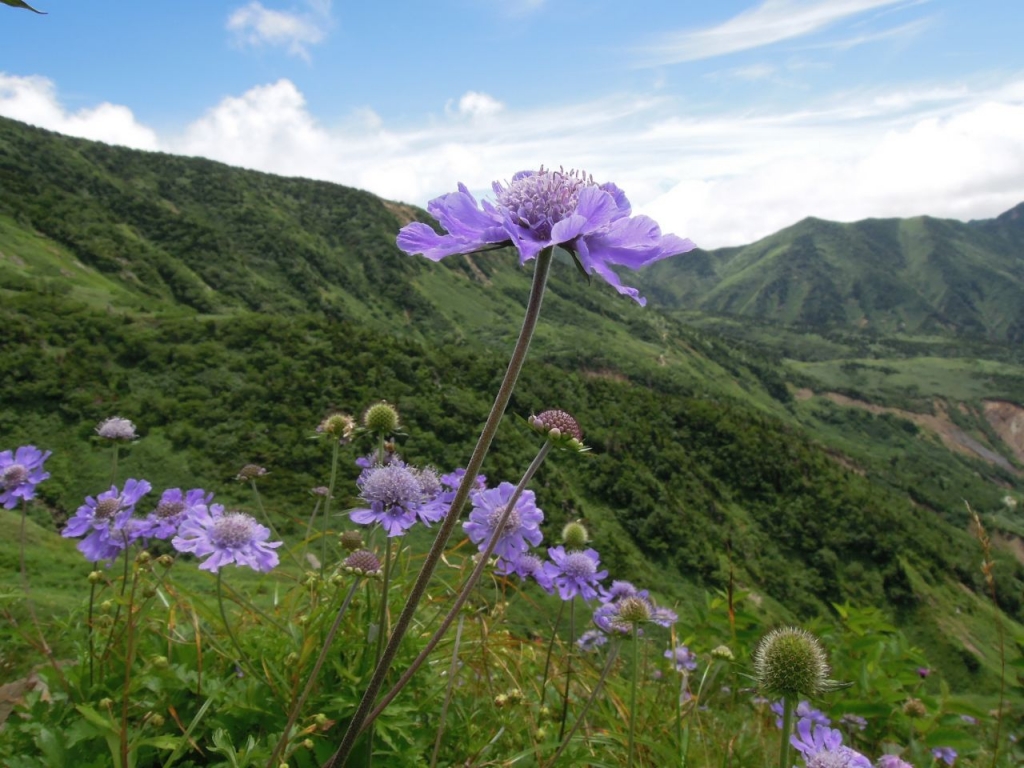 この日の白山は百花繚乱。こちらは「ゆっくり登ろう」がテーマなので、綺麗な花があれば足を止めては写真を撮る。観光新道の上部「馬のたてがみ」はまさに花園状態だ。ハクサンフウロ、シモツケソウ、ヨツバシオガマ、マツムシソウ、アザミなどピンクや紫の花々が咲き誇り、他にもさまざまな花が目を楽しませてくれた。黒ボコ岩の岩陰で昼食を取ったのち、笹がはびこる弥陀ヶ原の木道を歩いた。ササは年々高山植物を駆逐して弥陀ヶ原に広がっていく。ようやく見つけたクロユリは花弁を落としてつややかな緑の実となり、タテヤマリンドウが薄紫の小さな花を開く。エコーラインの南斜面では、カライトソウの赤やキスゲの鮮やかな黄色が風に揺れていた。汗をかいた皮膚にあたる風にいくぶん冷気の粒子を感じた。空には絹雲も現われて、白山は早くも秋の気配が忍び寄っていた。