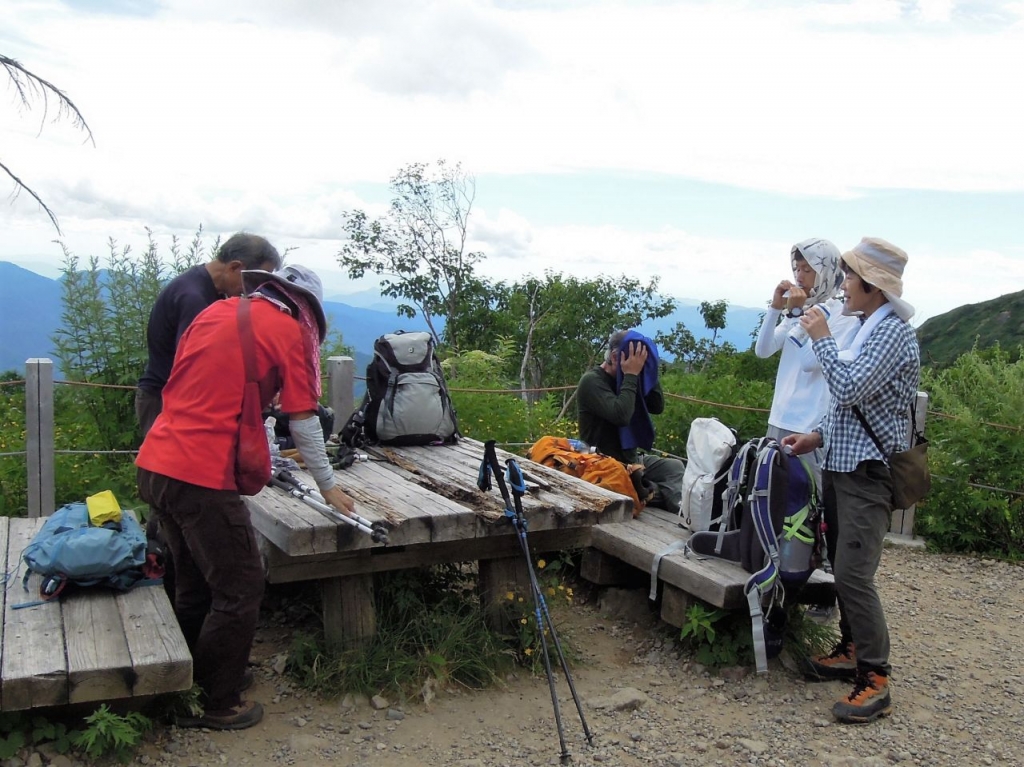 平日開催のためか参加者5名と控えめである。梅雨明け後は好天続きでこの日も晴れた。同じ日に、山頂へ行くランクテストが行われた。時間とコースが一部重複、帰路は甚之助小屋で偶然合流して一緒に降りてきた。ランクテストと言ってもあちらの参加者もCLとテスト受験者の二人のみ、気心知れたメンバーの個人山行みたいな例会となった。