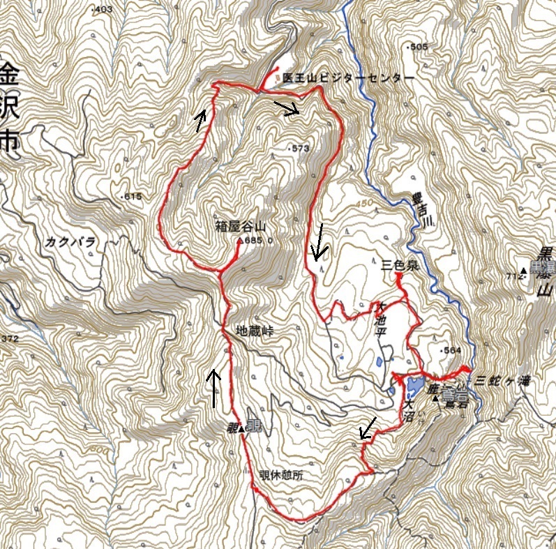 今回は医王山のいろいろなルートの中でも、医王ダム奥の医王山ビジターセンターから時計回りで箱屋谷山を最終目的としたコースにしました。まずは三色泉から三蛇ケ滝を寄り、大池平、覗休憩所から地蔵峠、箱屋谷山と周回して戻りました。