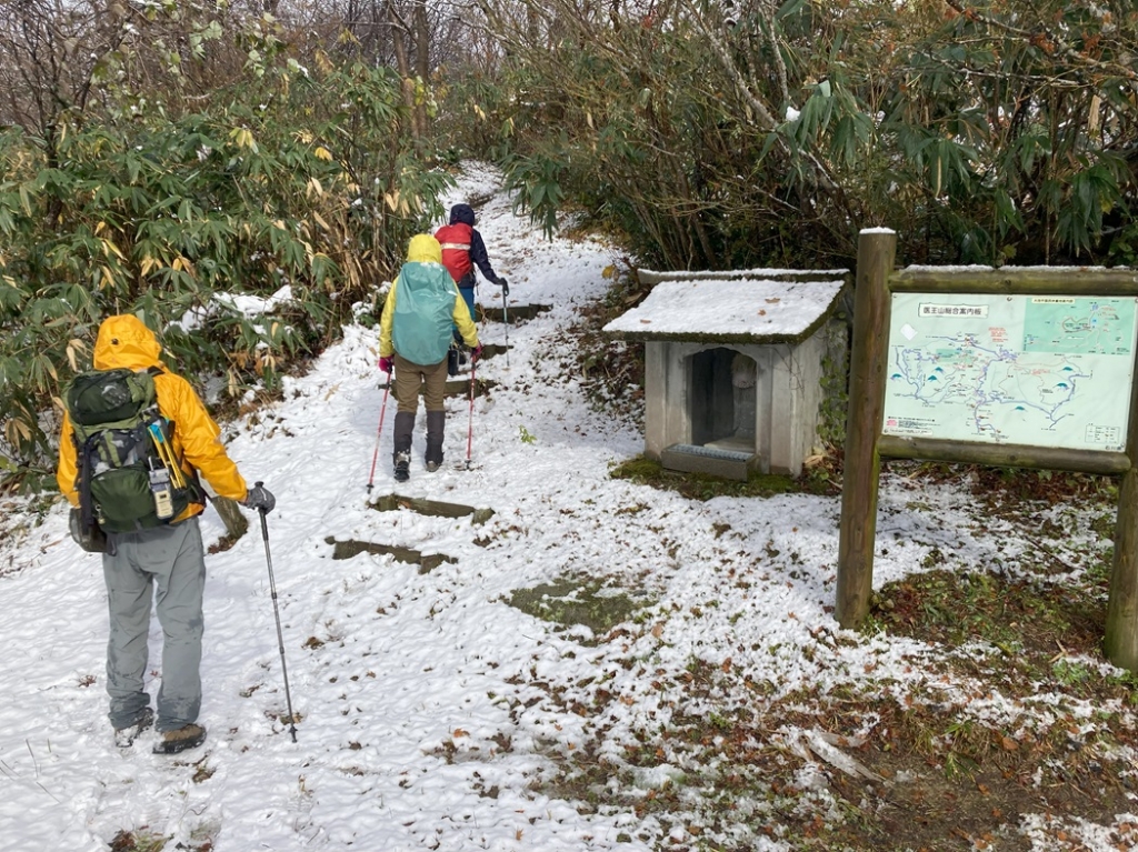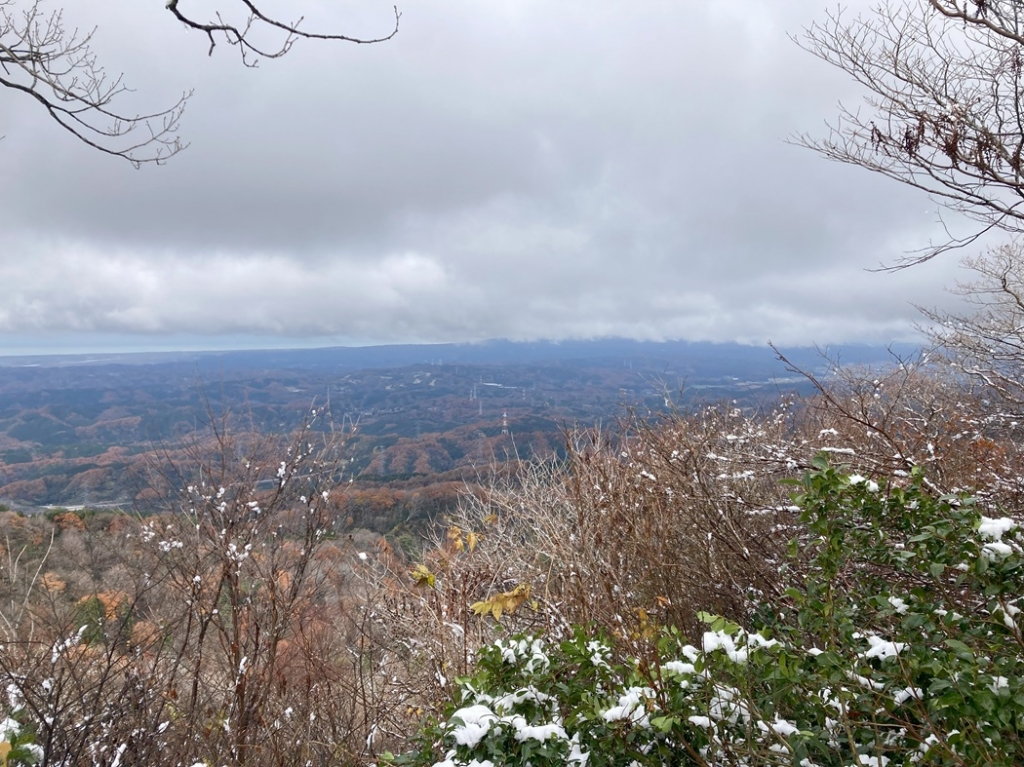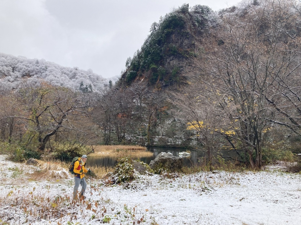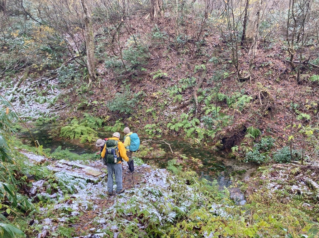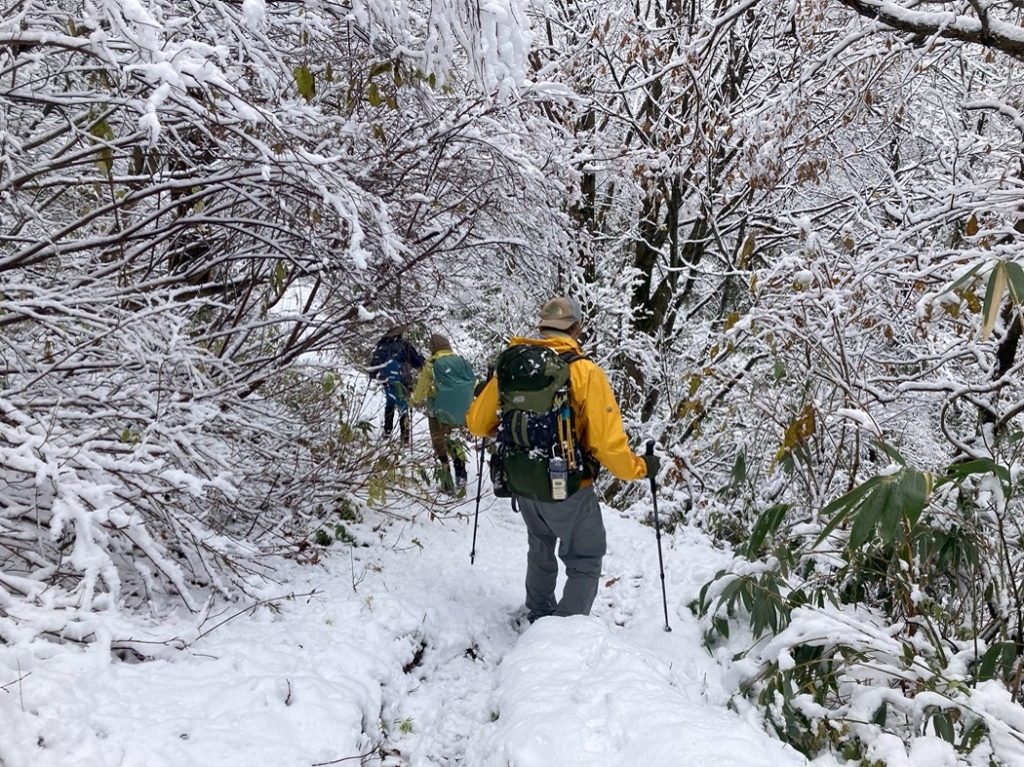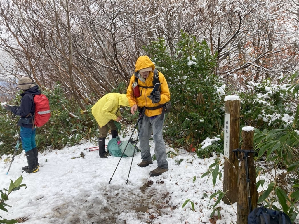 コース的には、歩き始めからまだ残っている紅葉を楽しみながら、迫力ある三蛇ケ滝や、覗から地蔵峠の尾根道では右に南砺市方面、左には金沢市内、箱屋谷山々頂では河北潟、日本海、宝達山は山頂が雲に隠れていましたが眺望はまずまずでした。また大池平周辺、覗休憩所から箱屋谷山間は積雪有りで、早くも雪道を歩け良かったです。