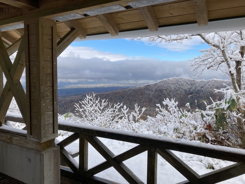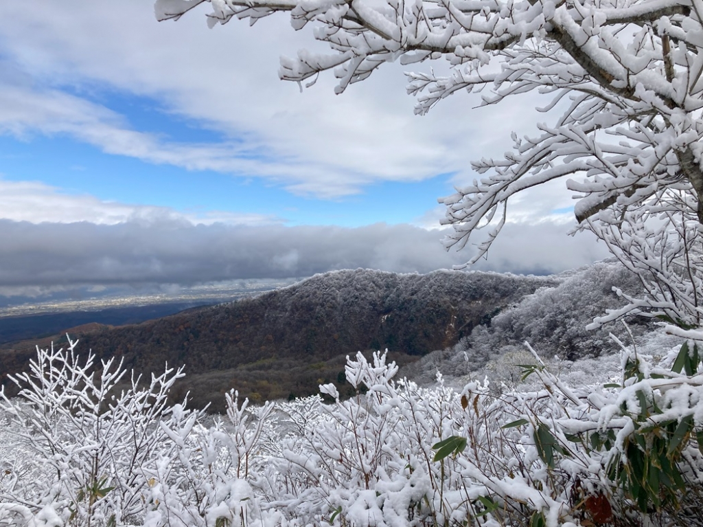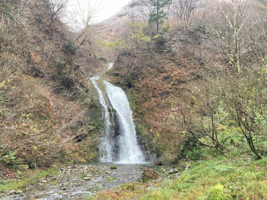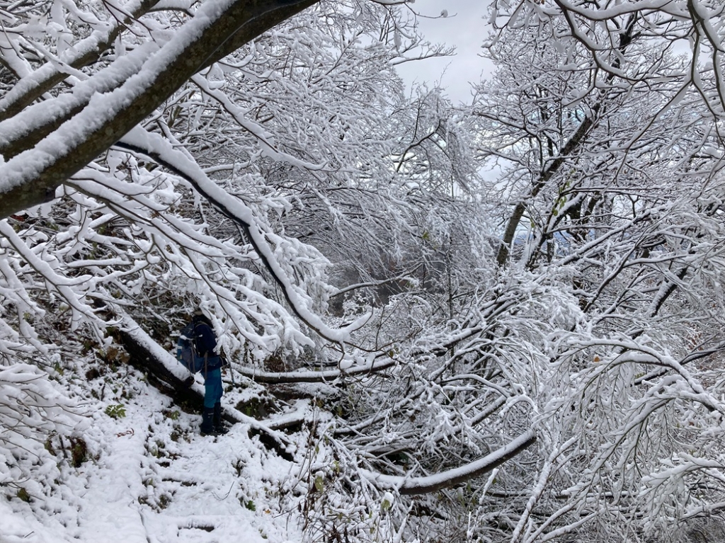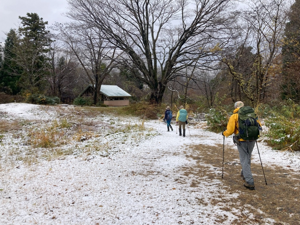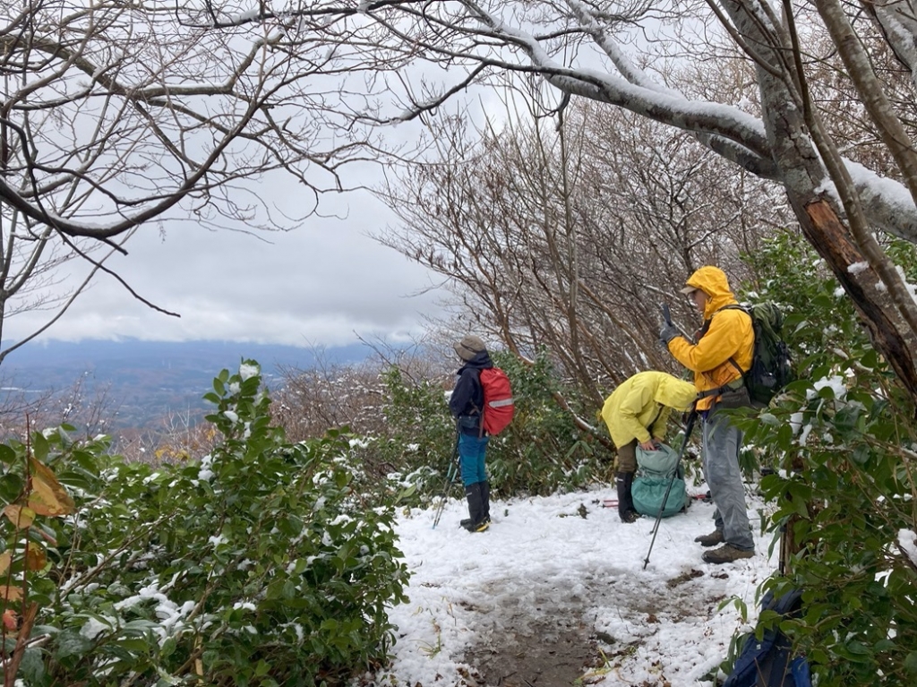 コース的には、歩き始めからまだ残っている紅葉を楽しみながら、迫力ある三蛇ケ滝や、覗から地蔵峠の尾根道では右に南砺市方面、左には金沢市内、箱屋谷山々頂では河北潟、日本海、宝達山は山頂が雲に隠れていましたが眺望はまずまずでした。また大池平周辺、覗休憩所から箱屋谷山間は積雪有りで、早くも雪道を歩け良かったです。