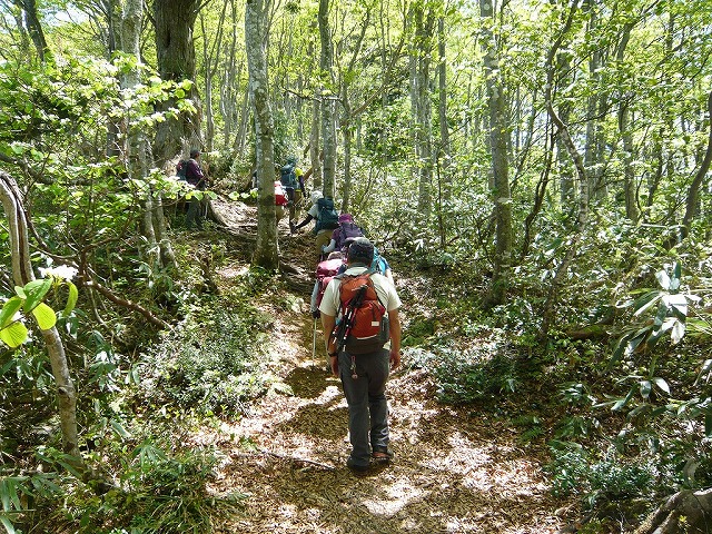 山道には番号札(○合目)が掛けられている。木漏れ日のブナ林、チゴユリ等を見ながら