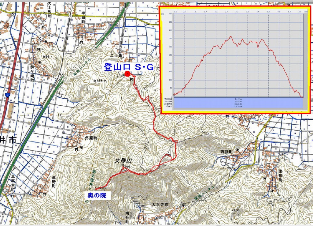 集合場所 7:00 → 金沢西(北陸道)I.C → 7:45 女形谷PA(トイレ休憩) → 福井I.C → 8:14 文殊山二上登山口駐車場 8:30 → 9:25 小文殊 → 9:40 大文殊 9:50 → 10:05 奥の院 10:15 → 10:35 展望台(昼食) 11:10 → 12:05 二上駐車場 12:20 → 13:45 集合場所