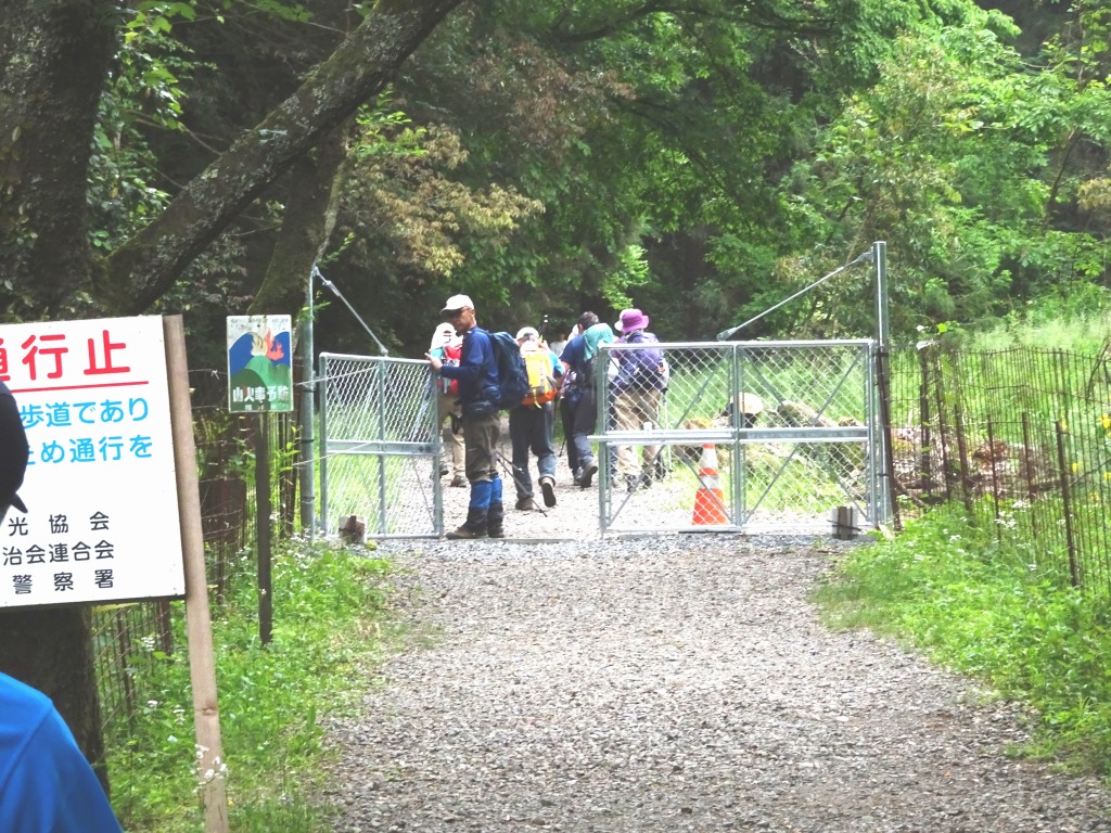 第一駐車場はすでに満車となり、第2駐車場に駐めましたが広い場所で余裕があります山の入り口は動物よけでしょうか、こういったゲートがありました