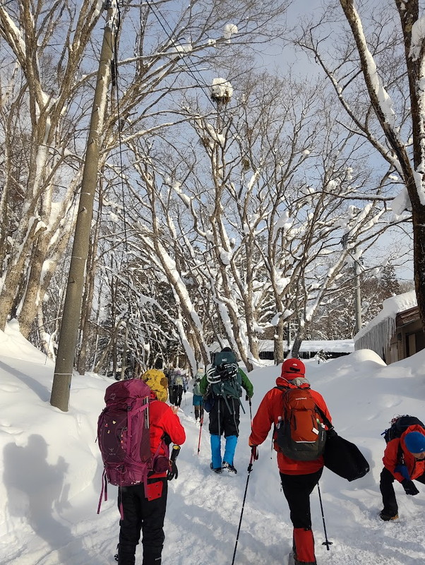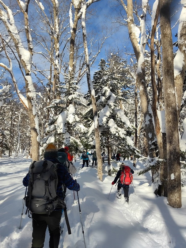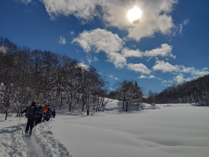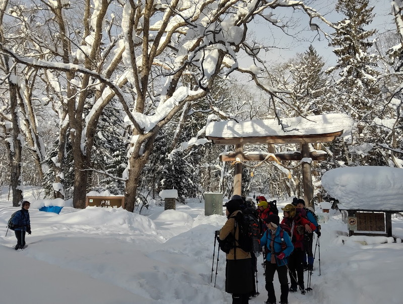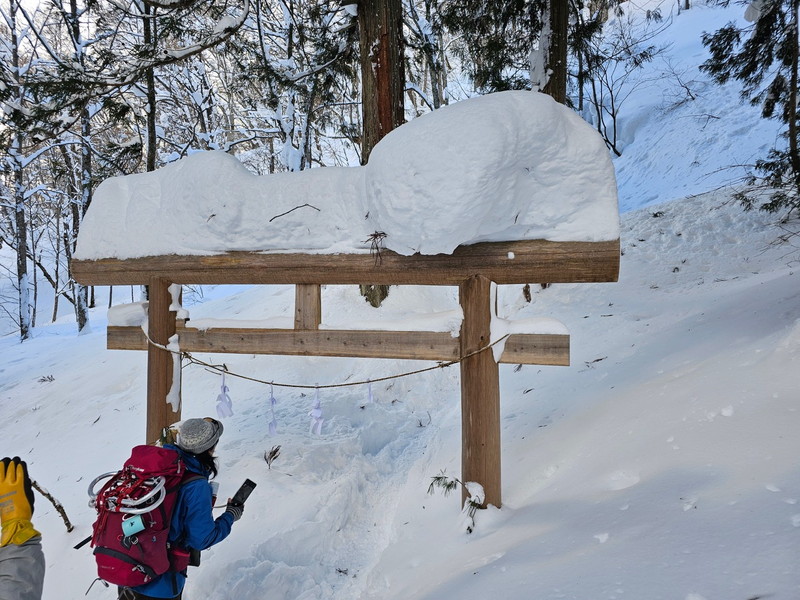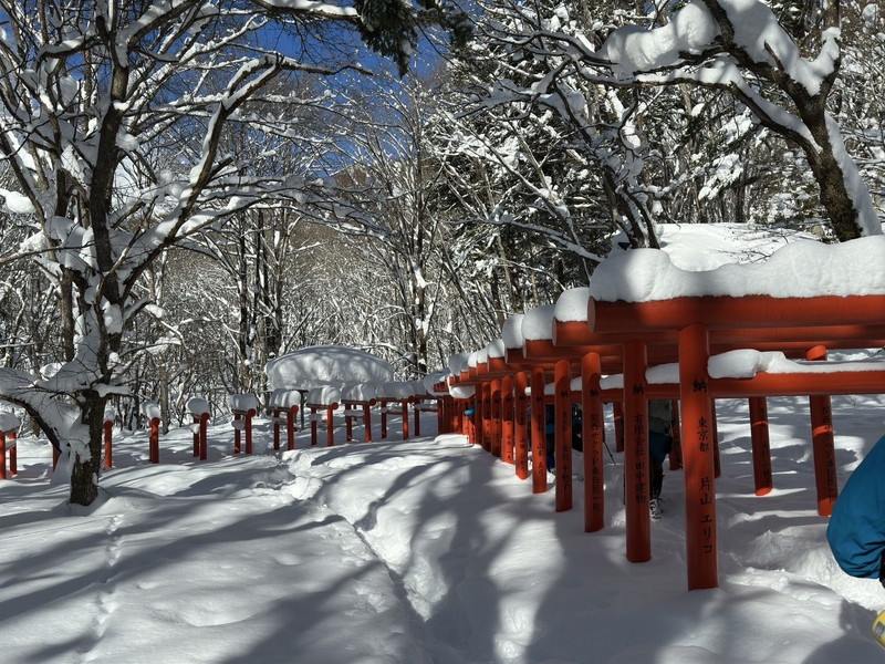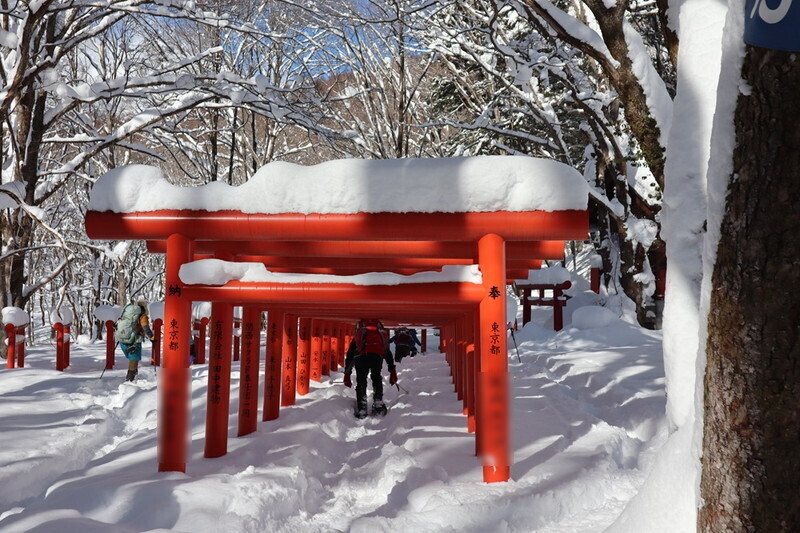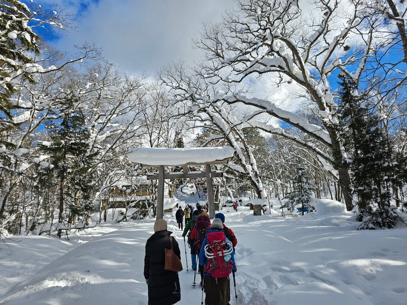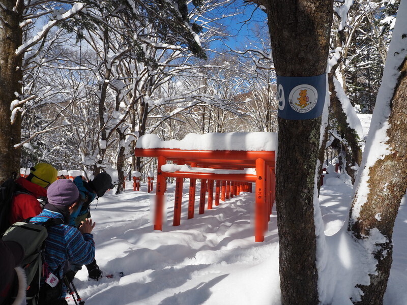 暫く歩くと大鳥居に到着。ここでワカンかスノーシューを装着し、鏡池を目指します。
