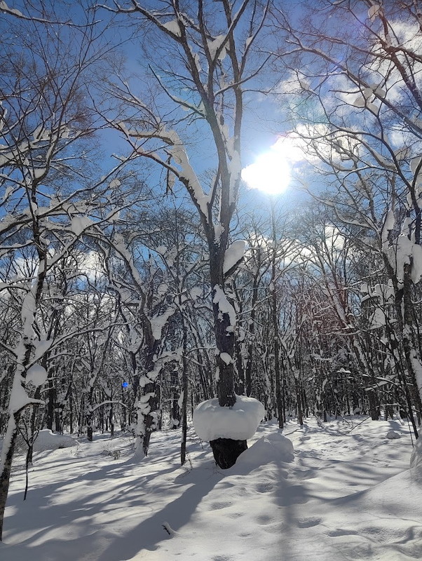 奥社入口から鏡池をまわって随神門まではワカンかスノーシューで、歩く人も少なく静寂な林の中を進みます。