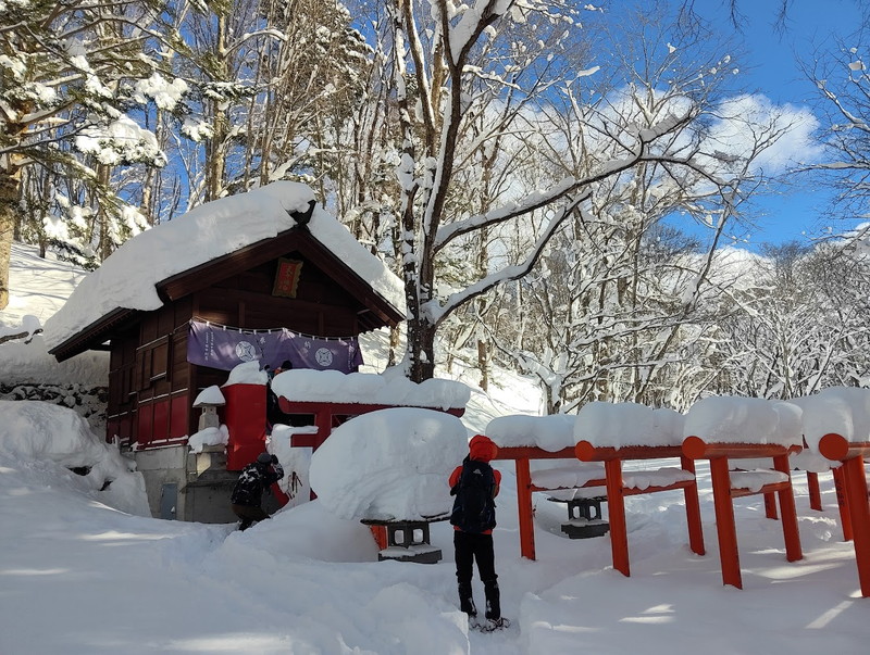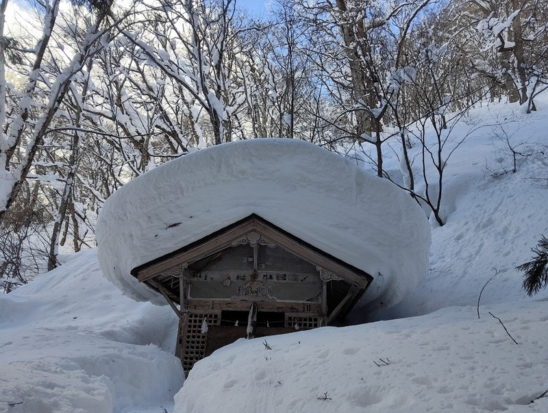 お社の手前の雪の中には一体何が!?一人が気になって掘り出すと、