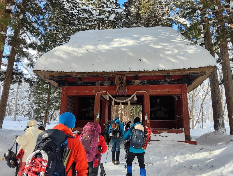 随神門に到着。これからチェーンスパイクに履き替え、奥社を目指します。