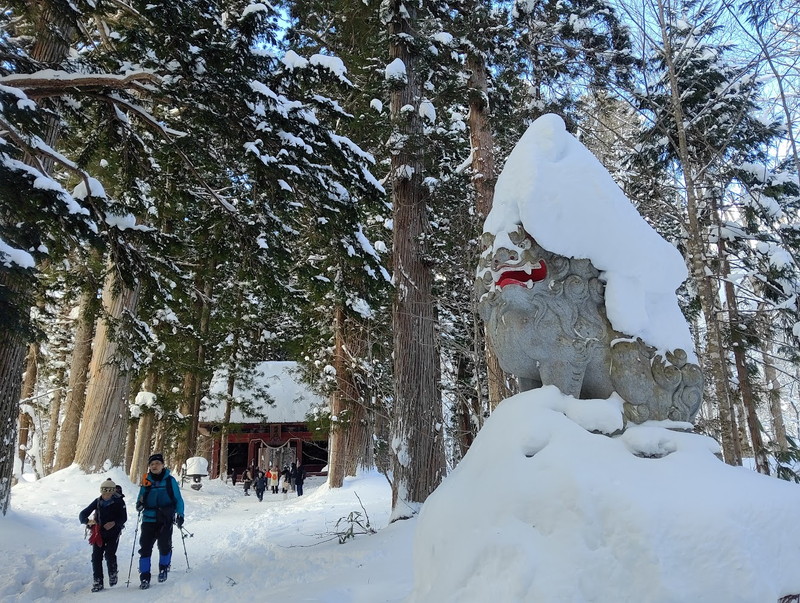 かわって随神門から奥社まではチェーンスパイクを装着、雪の中参道には海外の観光客も多く見受けられ、