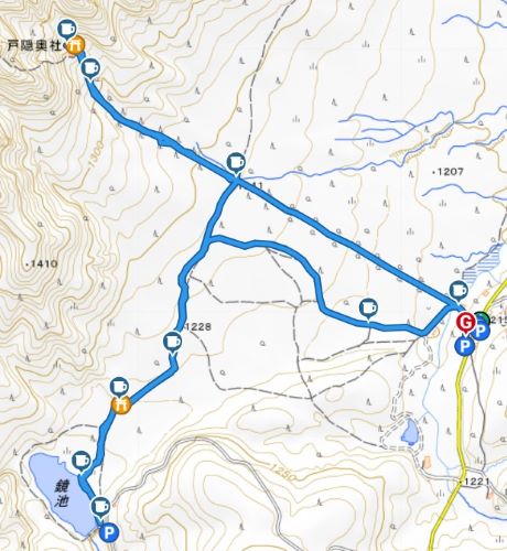 金沢市内P集合・出発5:30-戸隠神社奥社参拝者用P8:48~9:12-奥社入口9:15-戸隠観光協会取り付けフラッグ⑯-⑰-㉓-㉒-㉑