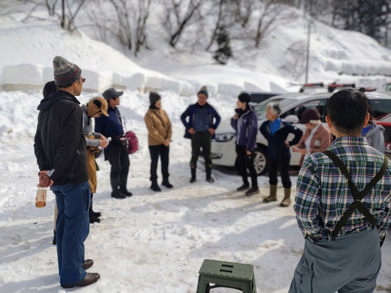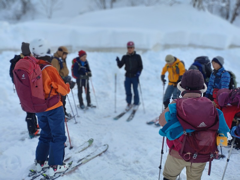 2.駐車場にてミーティング。CLより登りは山スキー、スノーシュー、ワカンの順番で皆一緒に行動、下山は各装備ごとにわかれる、スタート時は登り初めすぐの被服調整を避けるため寒いくらいの服装で!など注意事項がつたえられます。