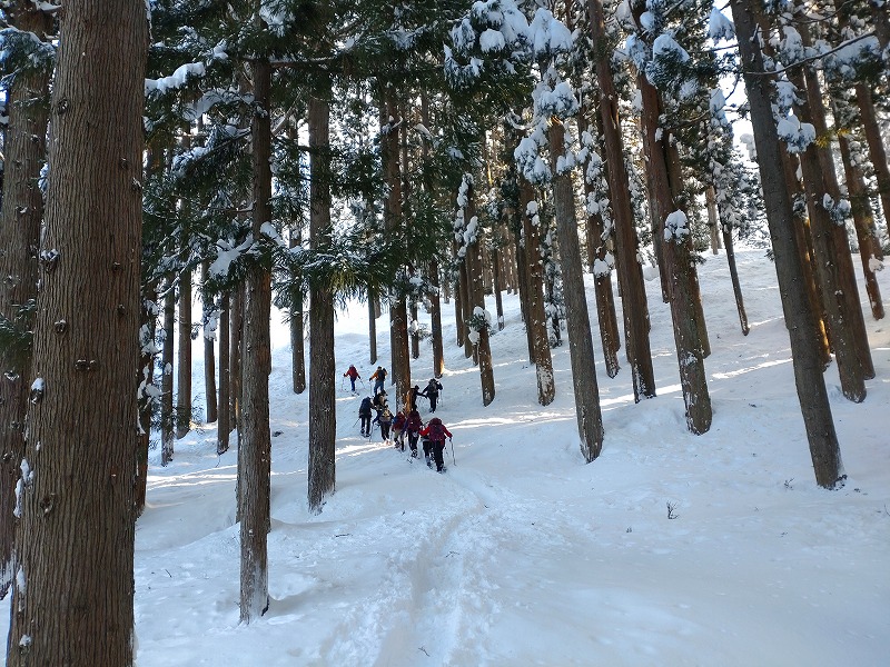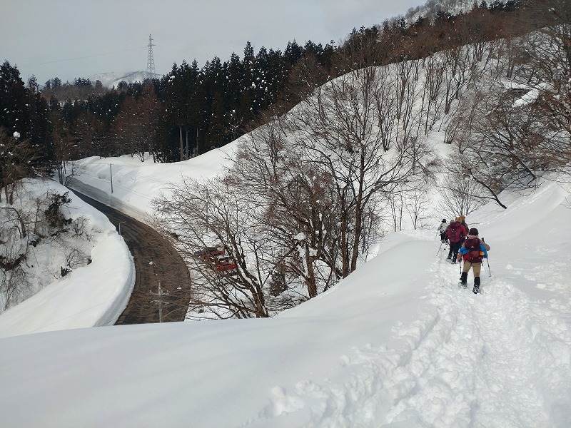 集合場所・出発7:00→おいの水谷の駐車場8:20→ 941m地点 9:30→ 護摩堂山10:50~11:30 → (山スキー、スノーシュー、ワカンにわかれて下山)→ おいの水谷の駐車場・解散13:00