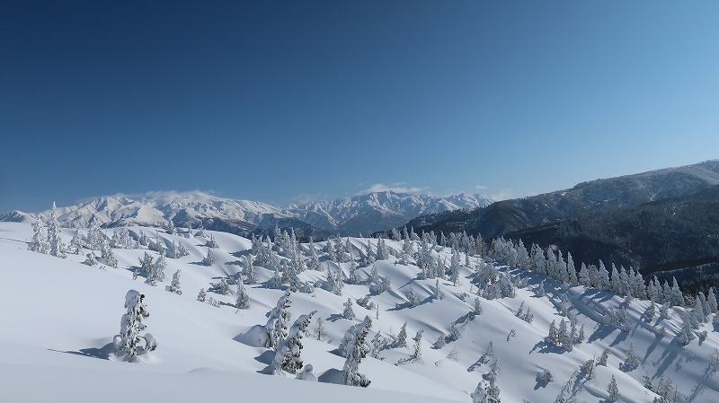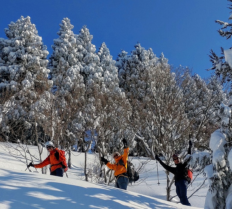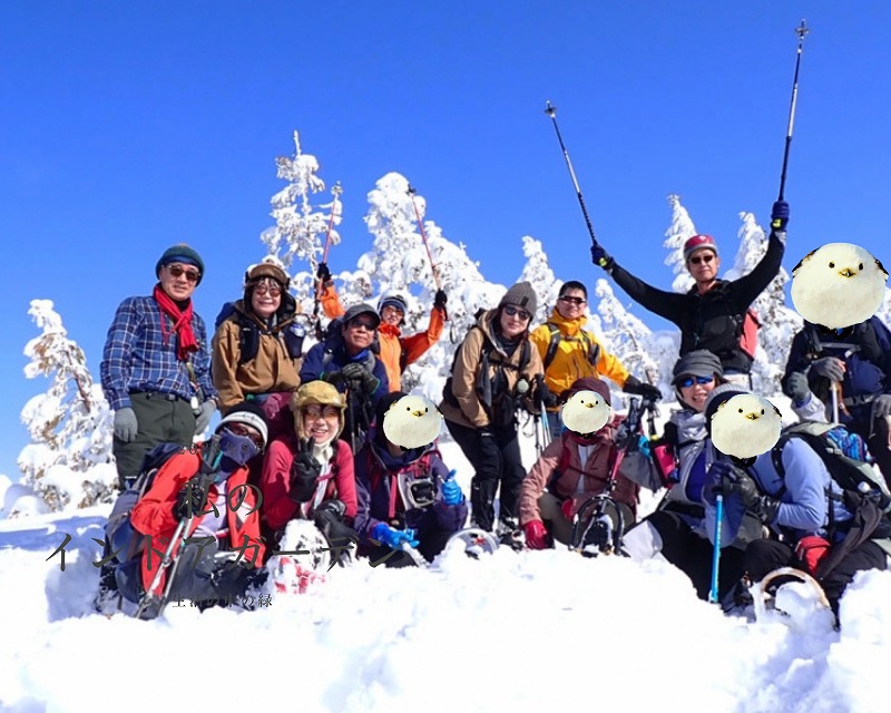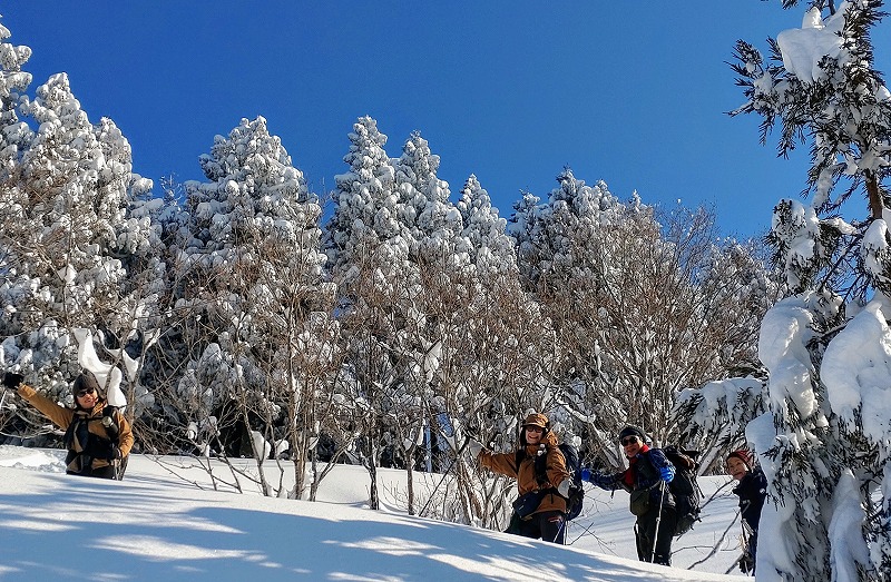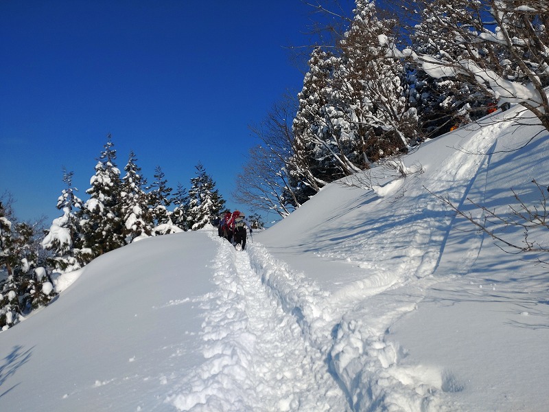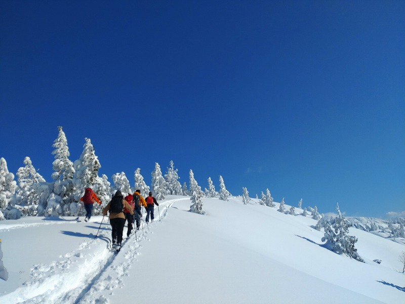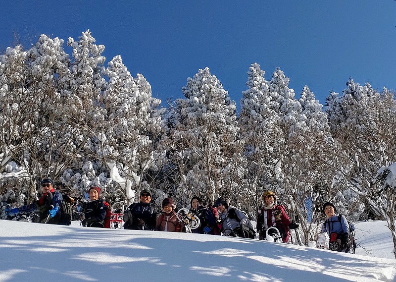 山スキー3名、スノーシュー4名、ワカン7名と装備の異なる編成での例会となりました。例会当日は、快晴と新雪に恵まれ、最高の1日となりました。CL、SLへ感謝の気持ちとともに例会を振り返りたいと思います。