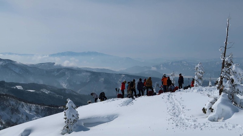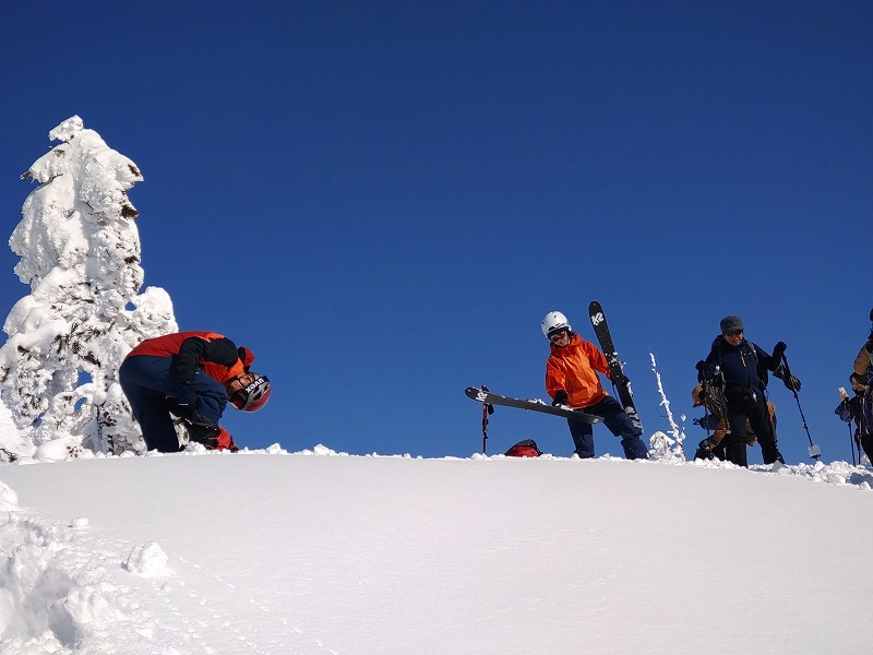 14.山頂に予定より1時間早く到着!山スキー班は山頂直下滑るべく滑走準備開始