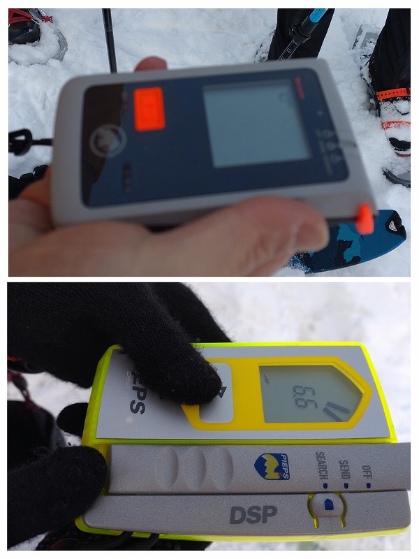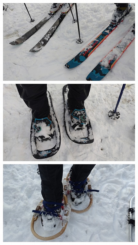 3.山スキー、スノーシュー、ワカンが勢ぞろい。山スキー班はスタート前にビーコンチェックです。