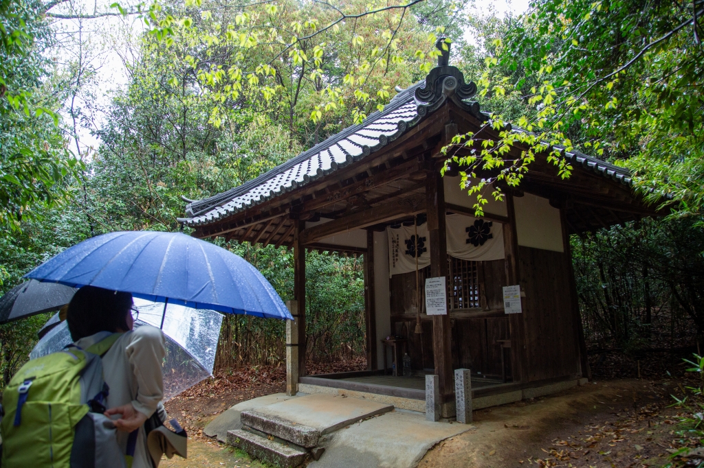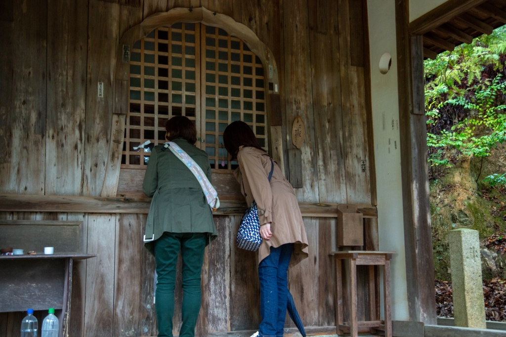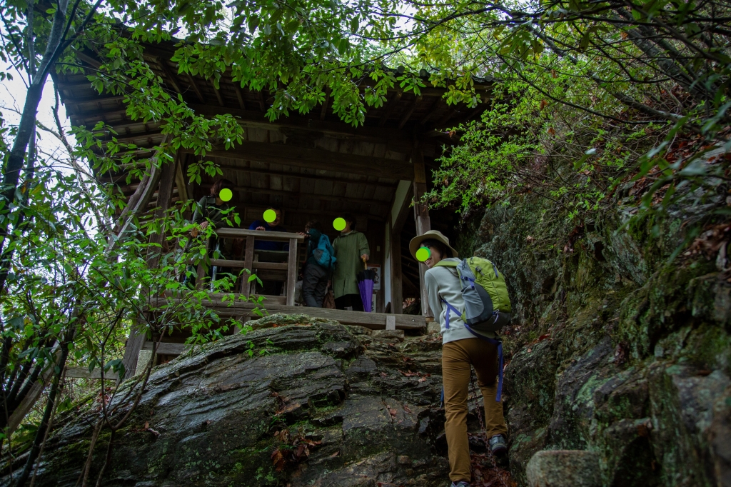 第53番札所の円明寺が建つのは、岩の上!岩を登るための鎖もあります。皆さんに見守られながら慎重に登ります。