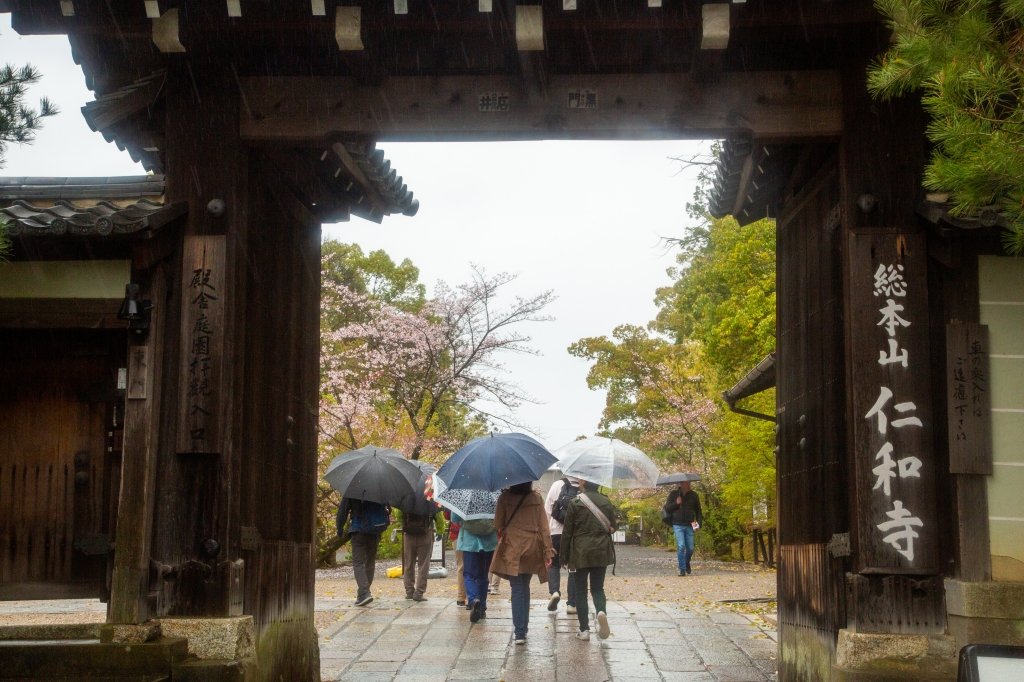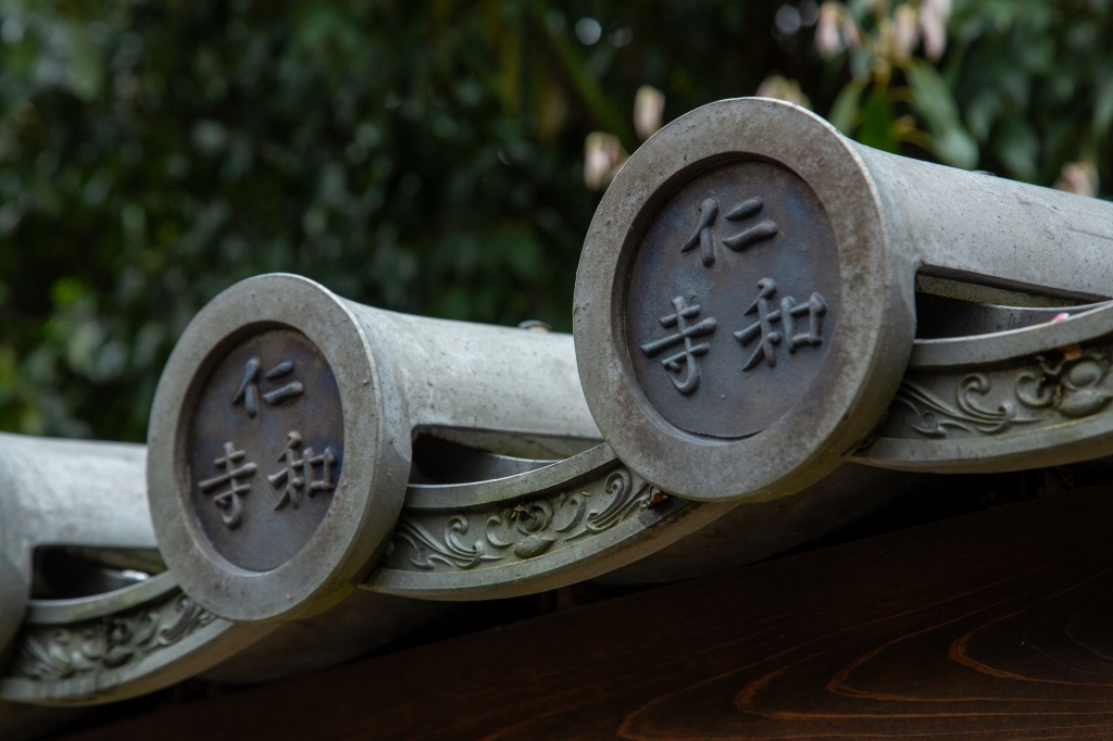 成就山を後に、原谷苑へ。途中仁和寺の横を通りますが、瓦一枚一枚に「仁和寺」と書かれていました。何枚あるのでしょう。