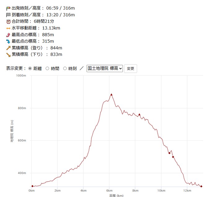 (距離:13.1km 登り:844m 下り:833m)