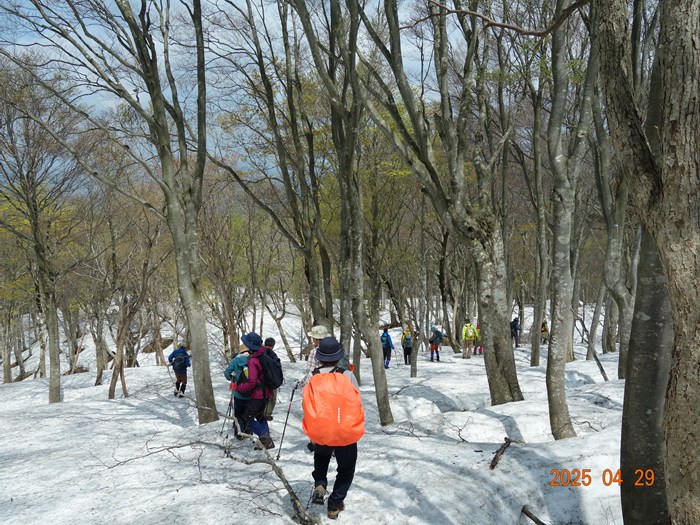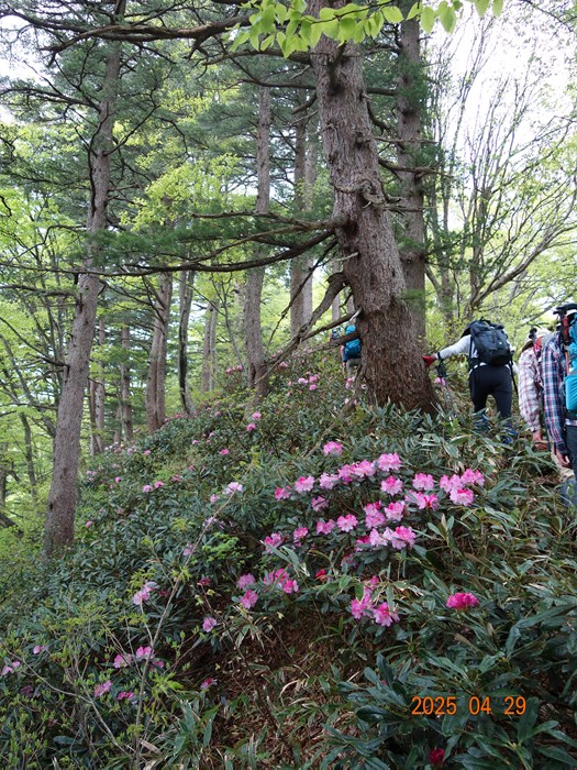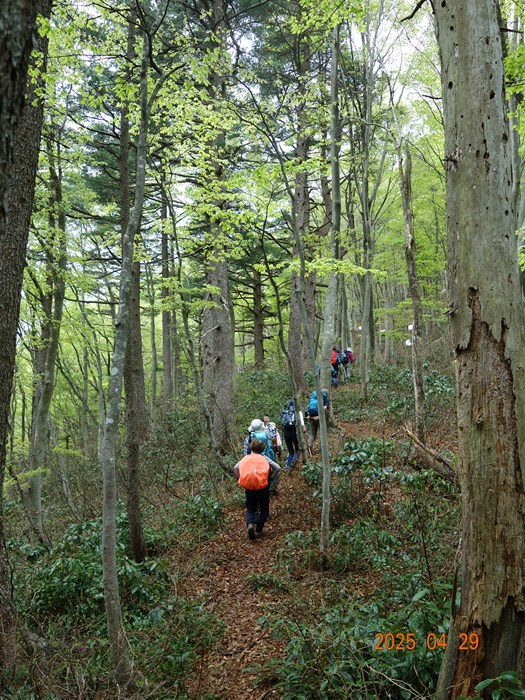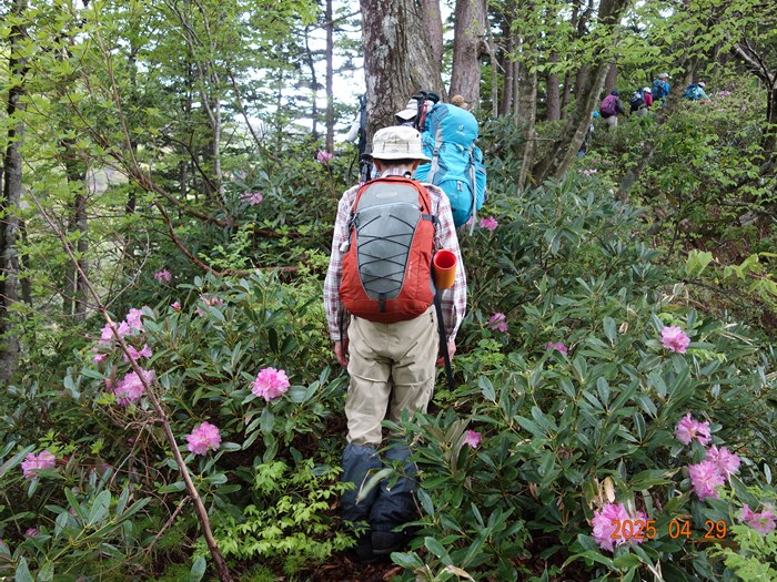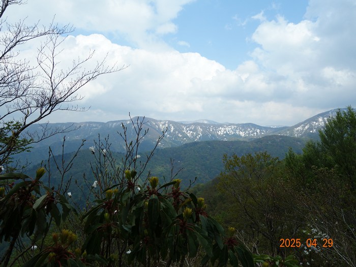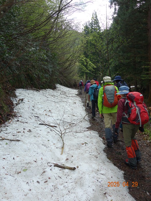 YamaReco 2県民の森 開園準備中小雨の中 朝礼(22名)公園内の林道を2班に分かれ歩く(約3kmの公園内林道)例年では林道で見られない残雪登山口に到着 水量の多い沢を渡る 登り初めから急登が続く(加賀の里山は登りはじめの急登が多い)シャクナゲロードが始まる 良く咲いている開花直前の赤色も可憐1213咲き始めも可愛い1516シャクナゲロードから「ブナ林」に変るイワウチワの群生山頂直下のルート分からずウロウロ白と緑の対比が素晴らしい山頂(889m)に到着(お疲れさまでした)3時間20分かかる帰路は尾根ルートを選ぶ(山頂直下の樹林帯に多くの雪が残っている)ブナ林の新緑が美しいタムシバと山々(山名不明)尾根ルートのシャクナゲ三つ葉ツツジ木の葉峠の分岐を過ぎ、キャンプ場に向かう(尾根ルートは思いの外アップダウンが多くある)キャンプ場の下山し、県民の森に向かうようやく到着 6時間21分(昼食時間除く)(開園式も終わりテントのみ)----------------------------------------------------------------コメント--------------------------------陶石山登山例会の動画もつくりました(参加者216)2025年「陶石山」頂上での昼食https://youtu.be/UTzd8YW9giQ2025年陶石山、残雪を歩くhttps://youtu.be/2KiePJDhoOs360度カメラで編集テストhttps://youtu.be/PoUsW4awcyI