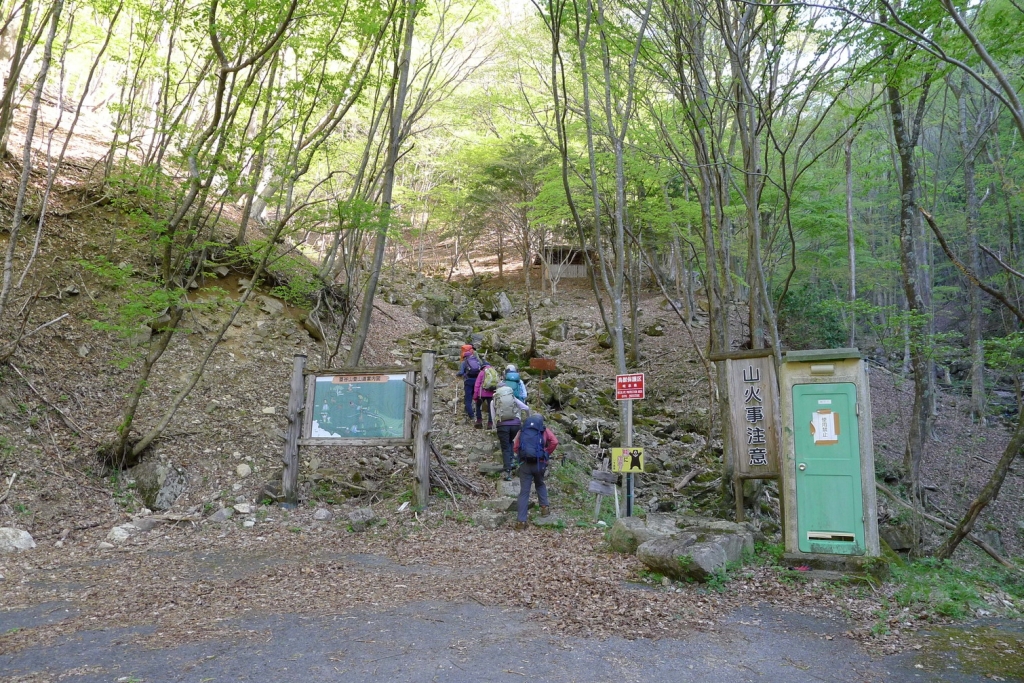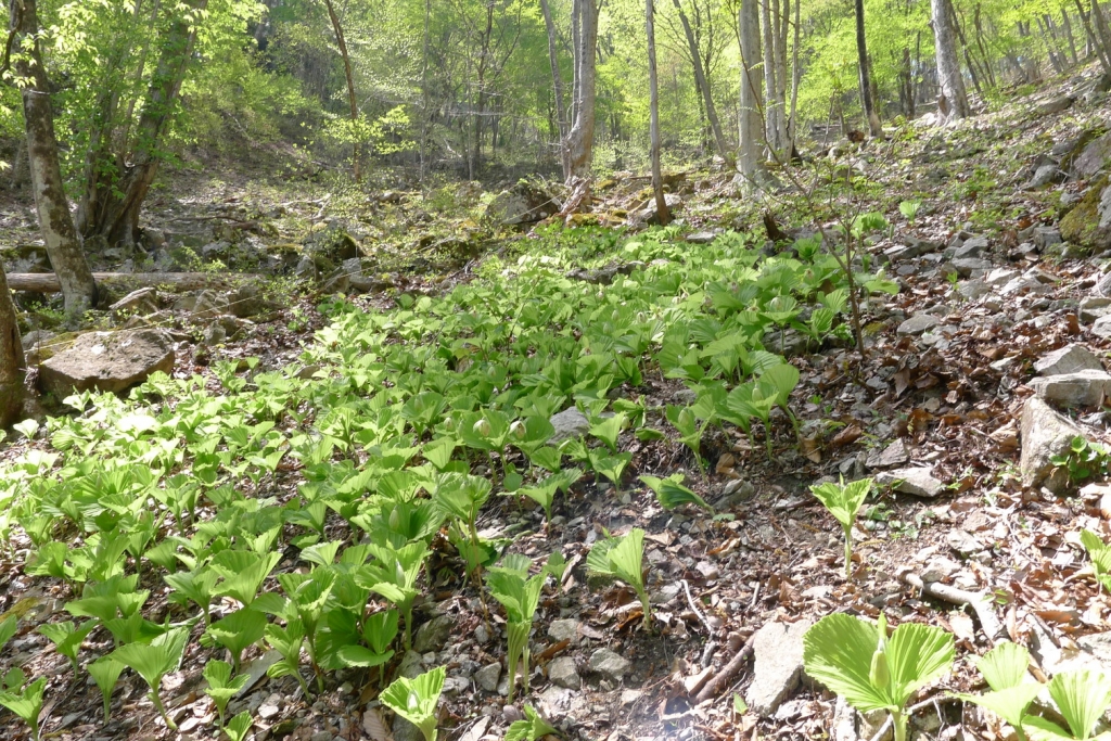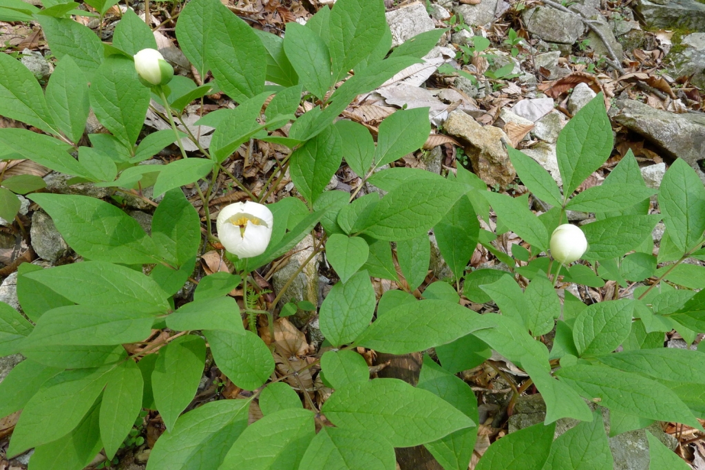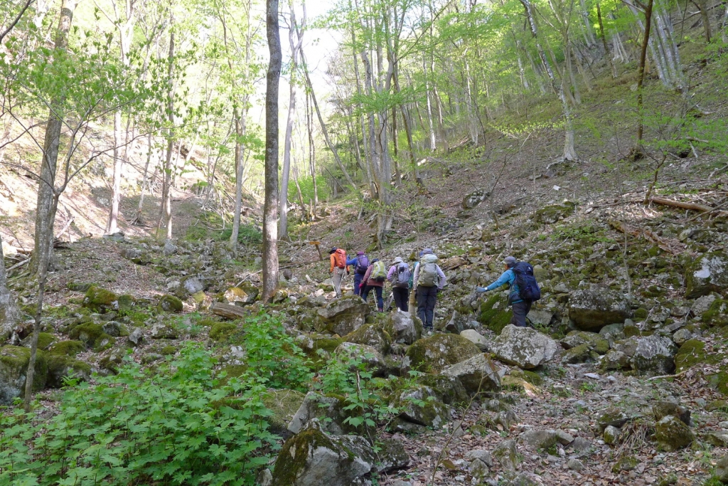 クマガイソウと山芍薬の花を見るためだ。特にクマガイソウは国の絶滅危惧種に指定されており、互いに尽きぬうちに見ておく必要があった。実は1週間前に下見をしている。その時は、谷筋に山芍薬のまだ固い蕾を数株見つけただけで、クマガイソウのほうは株の確認すら出来なかった。かわりに本物のクマがいて、子連れが私たちの50メートル先を横切って行った。1週間後のこの日は、ヤマレコの開花情報にも期待しながら、2台の先着車が停まる登山口から左まわりで周回した。