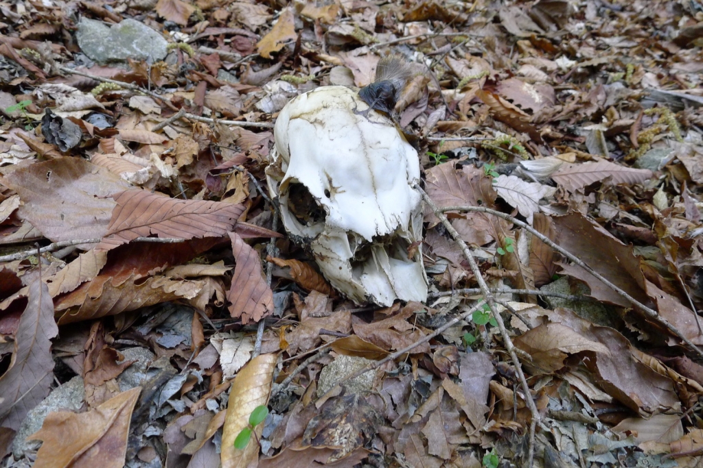 しばらく進むと、シカの頭蓋骨の出迎えを受けた。