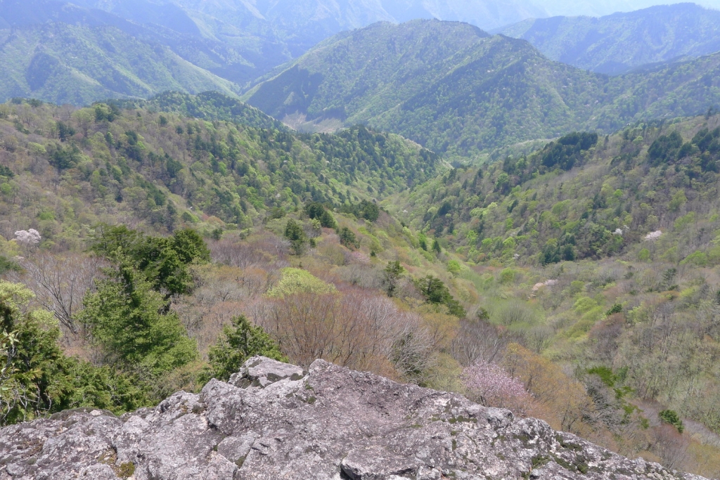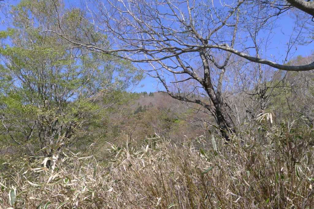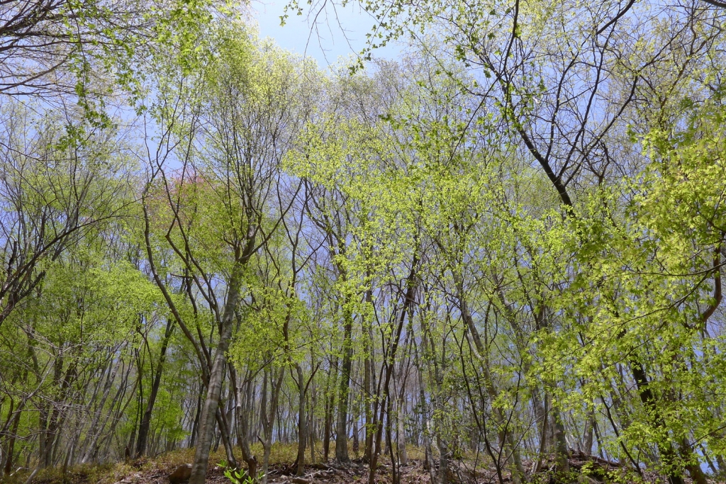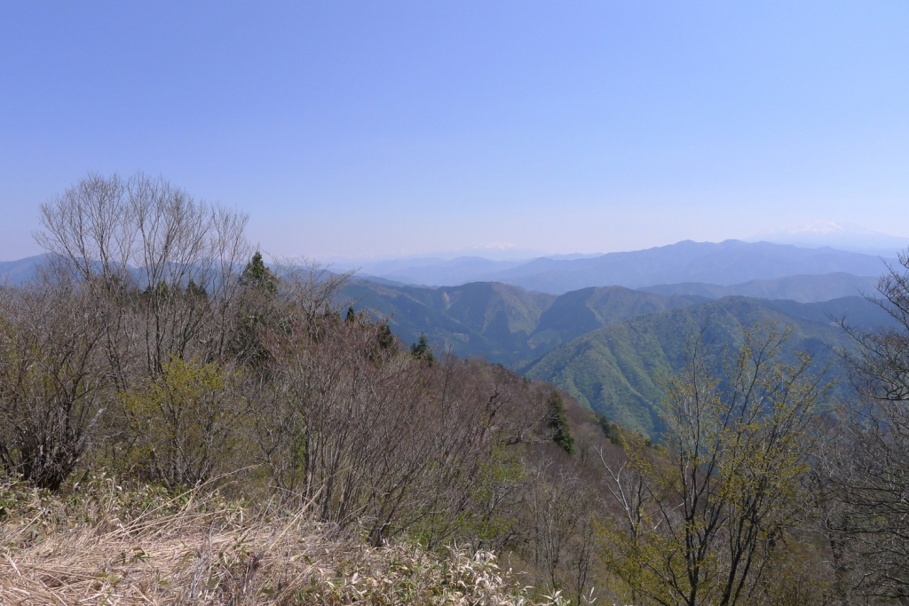 谷筋の山芍薬は緑の紡錘形の葉の間に白いピンポン玉のような蕾がふくらみ、花を半ば開いている個体もいくつかあった。清楚で品のある花に出会えた感動。山芍薬をあとに笹の中を続く登山道をのぼる。背の高いブナやホウノキなどが若葉をまとい、新緑が透過光に映えるダンコウバイは登るにつれてまだ黄色い花の姿を残す。オオカメノキの白い花、ピンク色の山桜が春の山にアクセントを添えている。山頂に着いた。4人グループが賑やかに食事をしていた。日差しはすでに初夏を思わせ、眺望は御嶽、乗鞍、北アルプスの笠ヶ岳など残雪の高山が霞に浮かんでおぼろげだった。