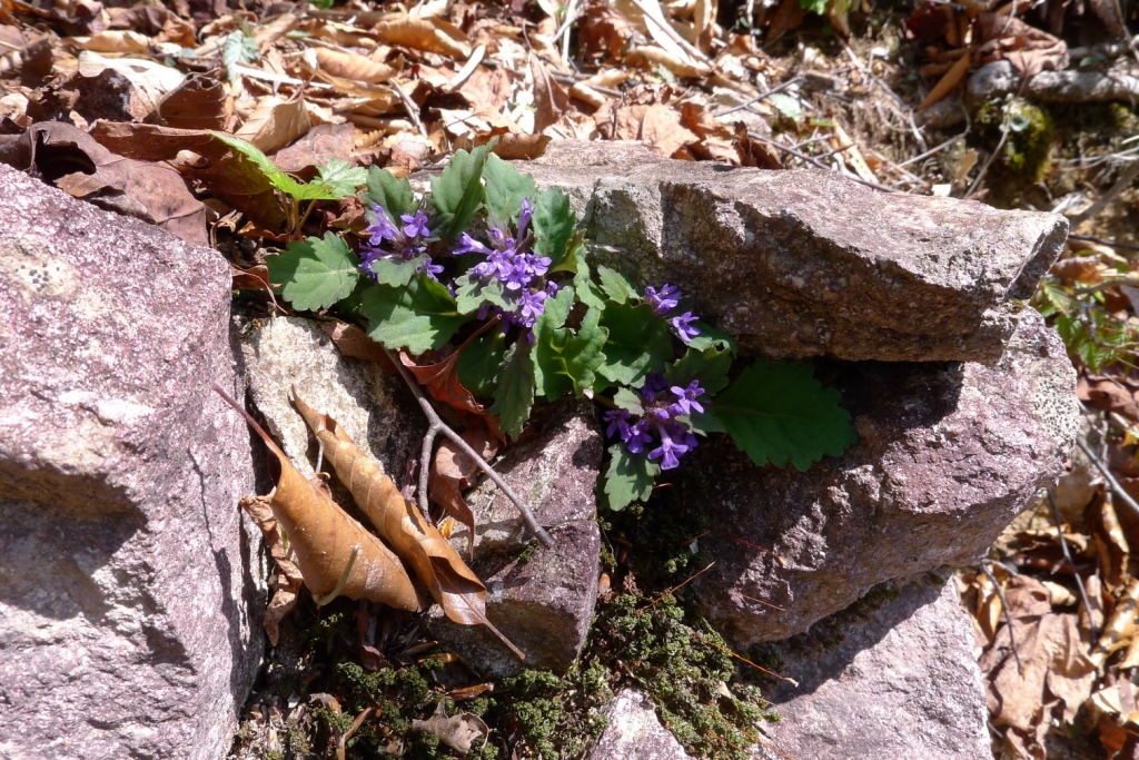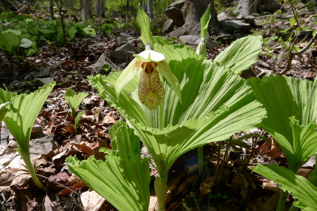 南尾根ルートを下る。周回行程を見下ろせる岳美岩に立ち寄り、途中の「小鹿の涙」と呼ばれる小滝で一休みした。さらに下った明るい灌木の斜面にそれはあった。クマガイソウの群落である。8m四方ほどをロープで囲われた斜面には、折り紙のように筋目が際立つ扇形の葉がびっしりと同じ方向を向いて風にそよぎ、どれも先端には白い蕾が膨らんでいた。手前の早熟な一株が見事に咲いていて、erotiqueとも形容できる肉色の筋が透けて見える花弁は強烈な印象だ。その名の謂れは「平家物語」に描かれた源氏の武将熊谷直実の母衣に花弁の形が似ているためとされる。