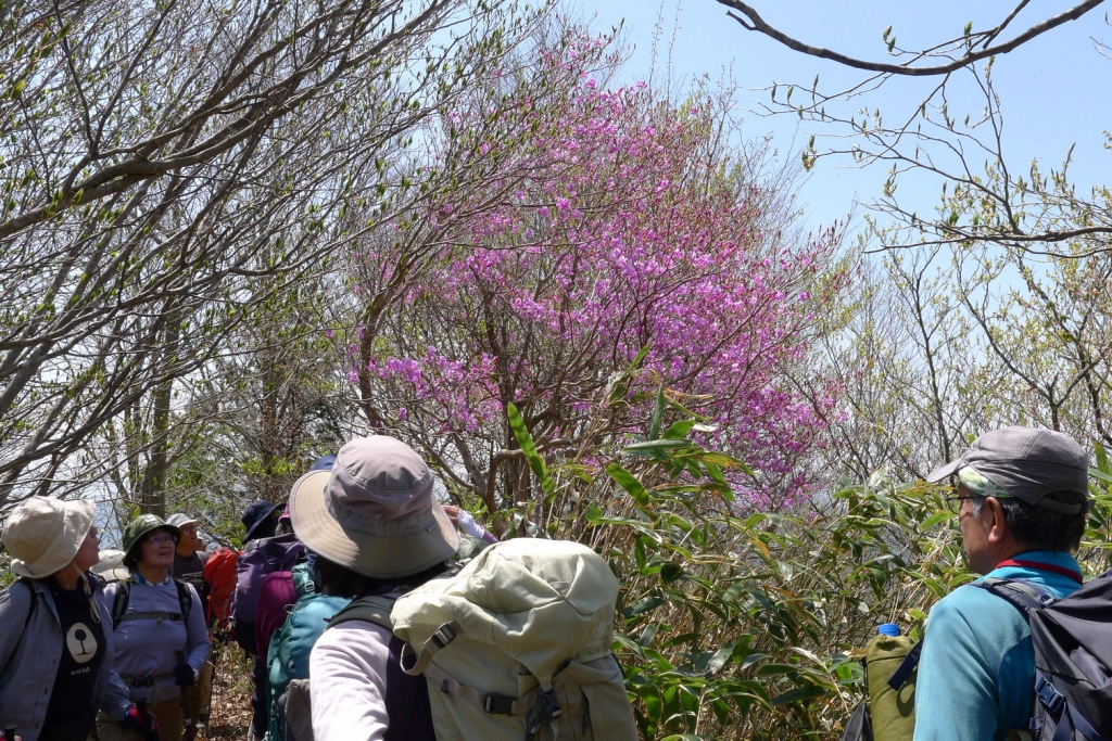 アカヤシオの前で他の登山客とすれ違い情報交換をする。