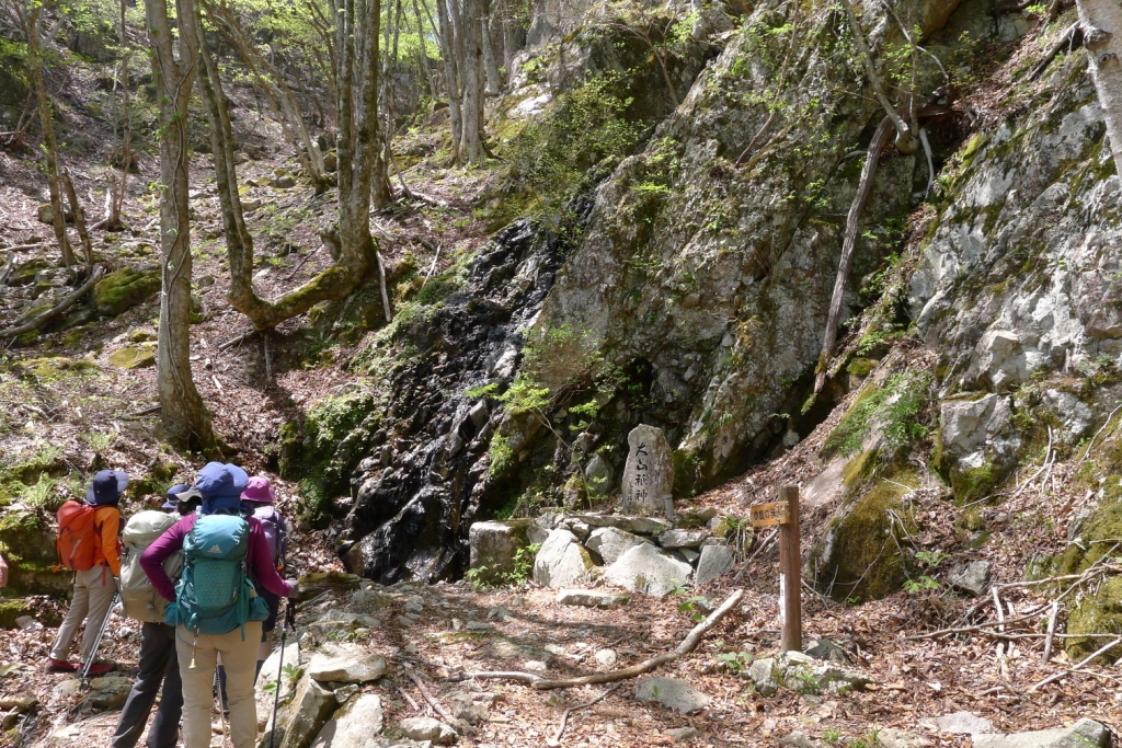 水場「小鹿の涙」で小休止。山と水の神様である「大山祇神」(おおやまつみのかみ)の石碑が傍らに建つ。